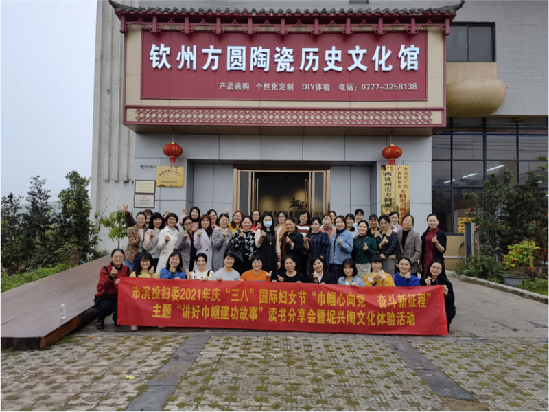 2021年3月8日,欽州市濱海新城投資集團有限公司婦委會圍繞“巾幗心向黨,奮斗新征程”主題,組織開展2021年慶“三八”國際勞動婦女節(jié)“講好巾幗建功故事”讀書分享會暨坭興陶文化體驗活動,活動在欽州方圓陶瓷歷史文化館舉行。