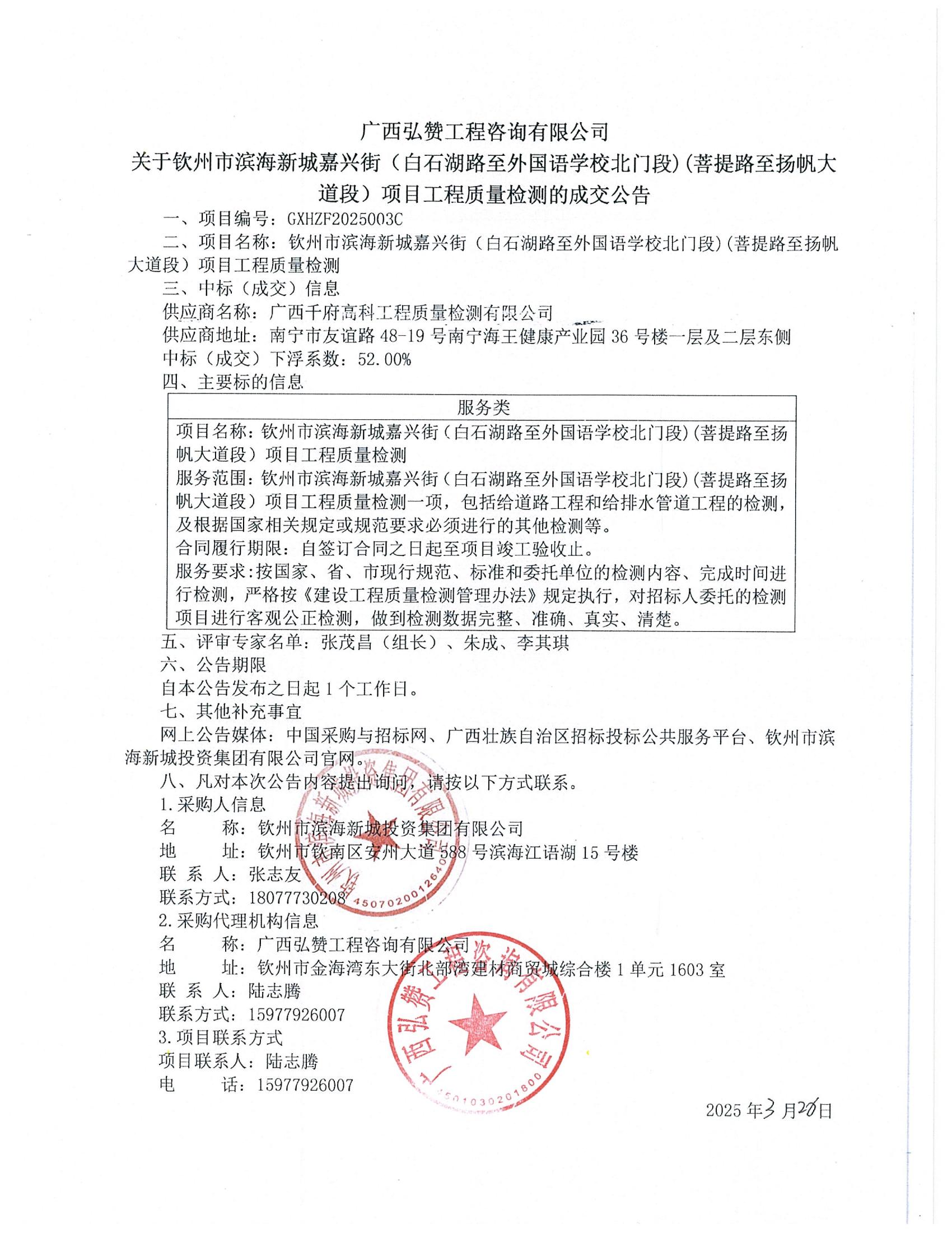 欽州市濱海新城嘉興街(白石湖路至外國(guó)語(yǔ)學(xué)校北門段)(菩提路至揚(yáng)帆大道段)項(xiàng)目工程質(zhì)量檢測(cè)的成交公告