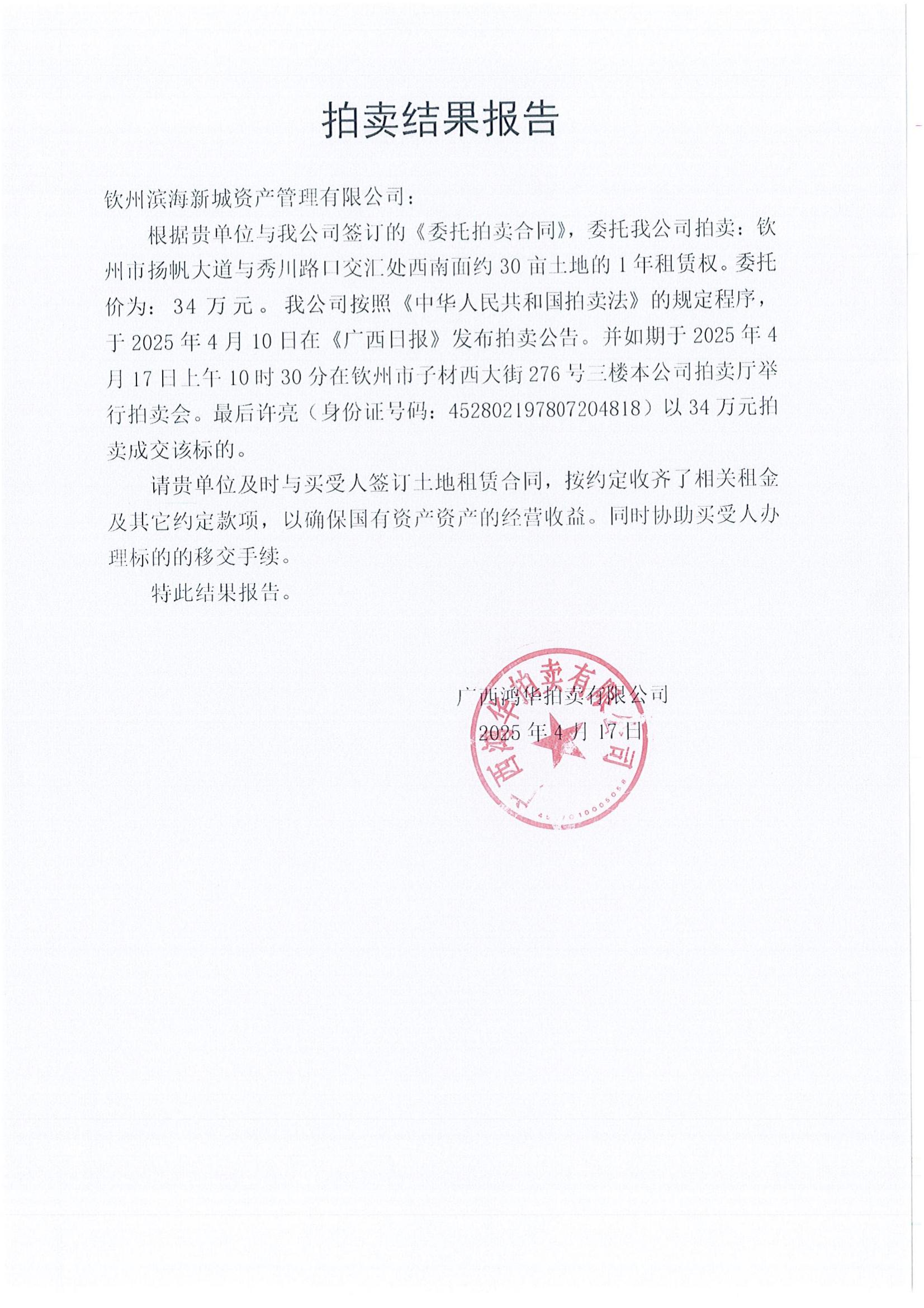 欽州市安州大道西側(cè)、嘉興街南北側(cè)約760㎡土地的5年租賃權(quán)拍賣文件(點(diǎn)擊下載全文)