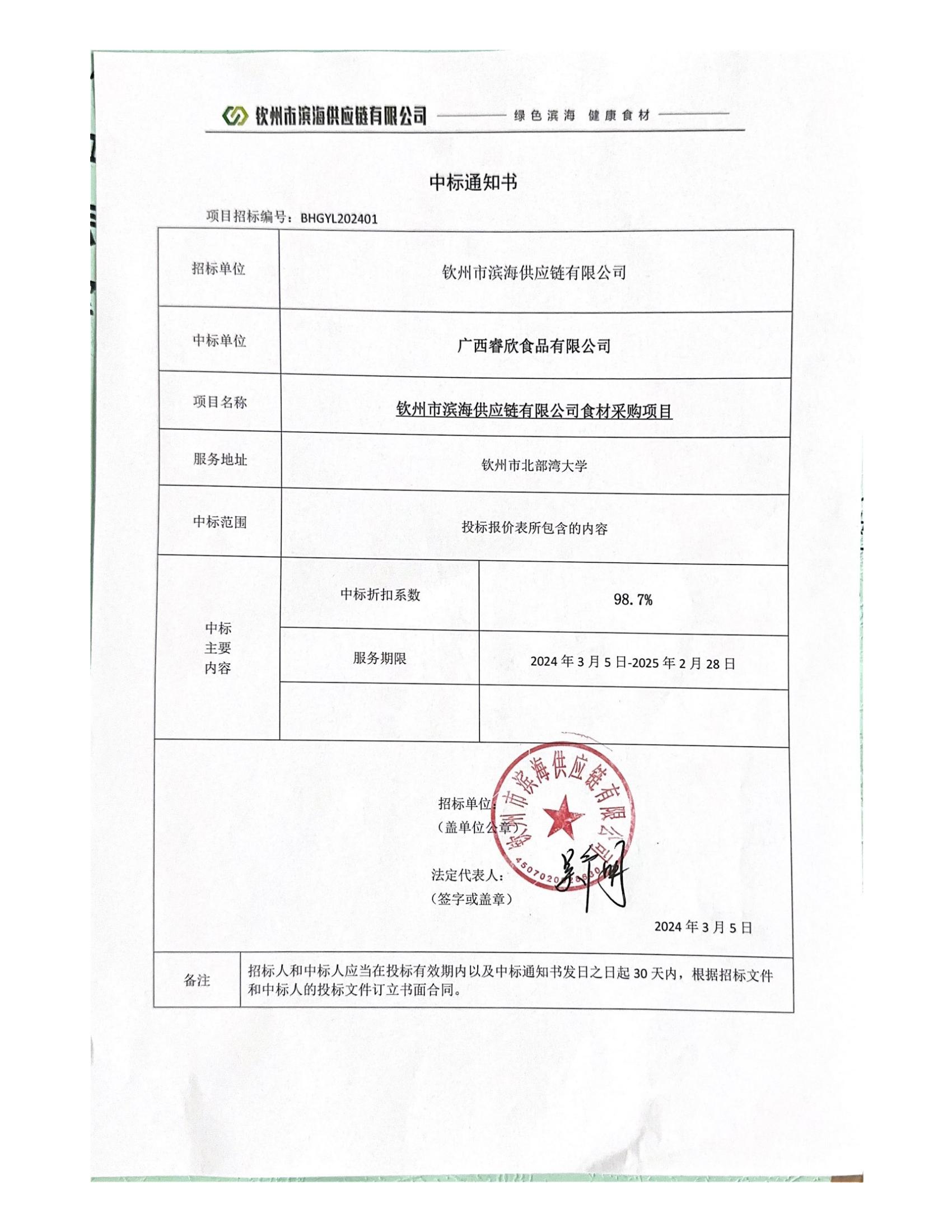 中標(biāo)通知書(欽州市濱海供應(yīng)鏈有限公司食材采購項(xiàng)目)