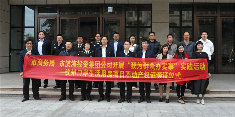 2021年11月23日上午,市商務局、市濱海投資集團公司在市濱海投資集團公司12樓黨員活動室聯合開展“我為群眾辦實事”主題實踐活動,舉行欽州口岸生活用房項目不動產權證頒證儀式。市濱海投資集團公司黨委副書記卜玉聲同志主持會議,市商務局黨組書記、一級調研員王紹平同志出席會議并講話。