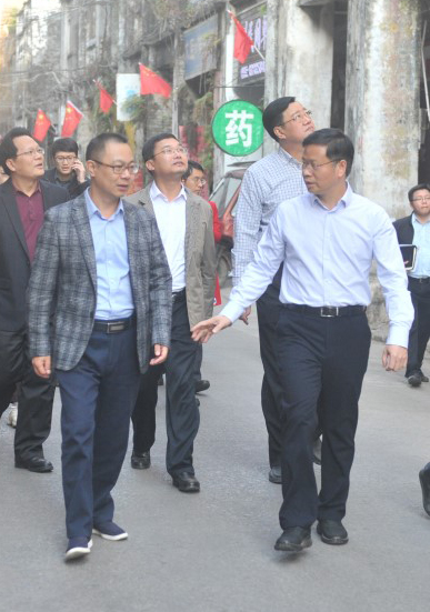 譚丕創(chuàng)市長沿著中山路步行至占鰲巷,實地調研歷史文化街區(qū)保護和老城區(qū)改造提升工作,聽取了集團公司董事長趙文博對中山路、占鰲巷、蘇廷有故居的提升改造匯報工作。