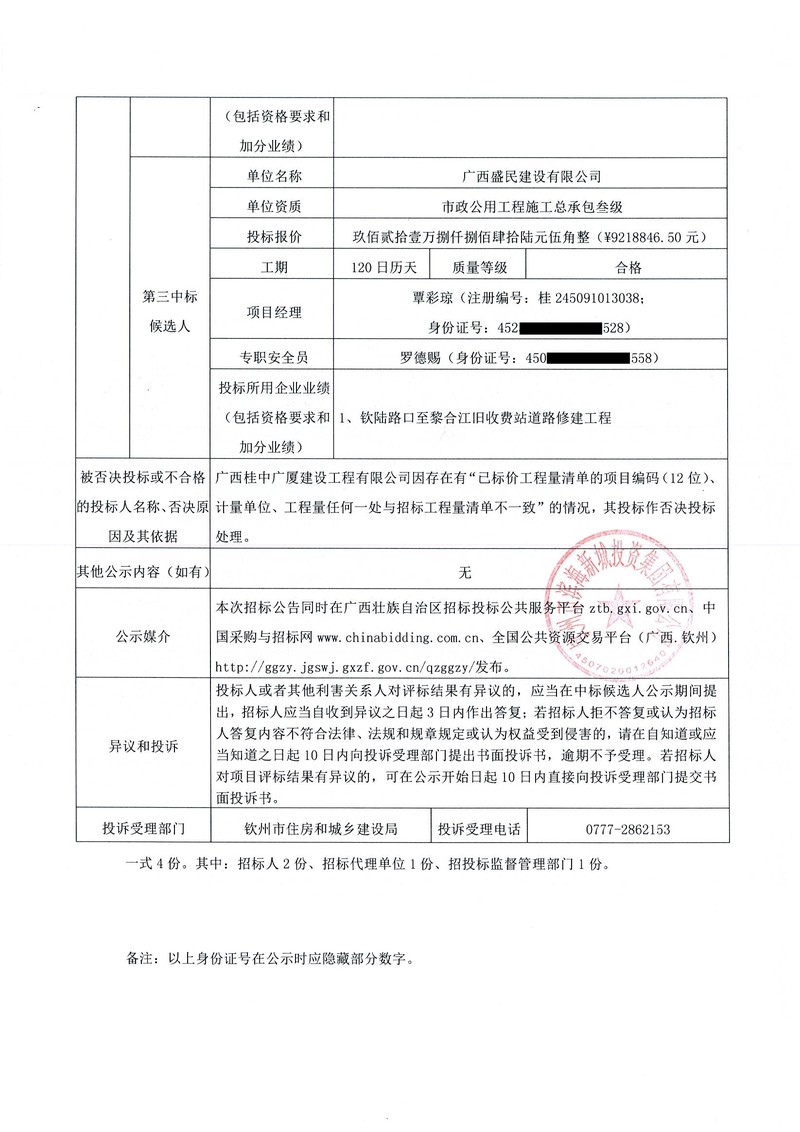 欽州市老舊城區改造提升項目中山路、占鰲巷道路改造及占鰲巷8號房屋加固修繕工程-中標候選人公示