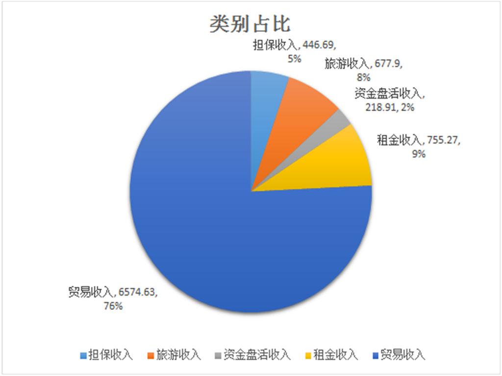 1-10月,集團公司經營收入為8673.4萬元,同比去年增長337 %。其中:貿易收入6574.63萬元,占比76%;擔保業務收入446.69萬元,占比5%;資金盤活收入218.91萬元,占比2%;八寨溝旅游收入677.9萬元,占比8%;租賃收入755.27萬元,占比9%。