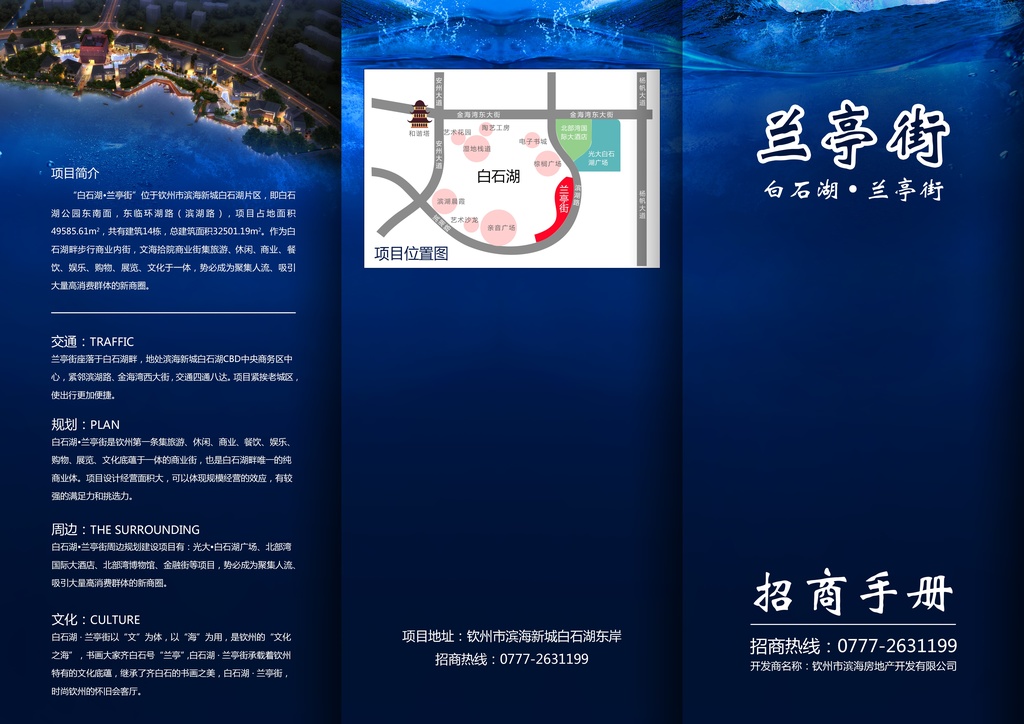 白石湖蘭亭街項目坐落于欽州濱海新城白石湖畔,毗鄰光大商圈,由風格獨特的獨立式建筑群組成。項目占地面積49585.61㎡,總建筑面積32501.19㎡,地下停車場300多個停車位。作為白石湖畔步行商業內街,蘭亭街集旅游、休閑、商業、餐飲、娛樂、購物、展覽、文化于一體,勢必成為聚集人流、吸引大量高消費群體的商圈。