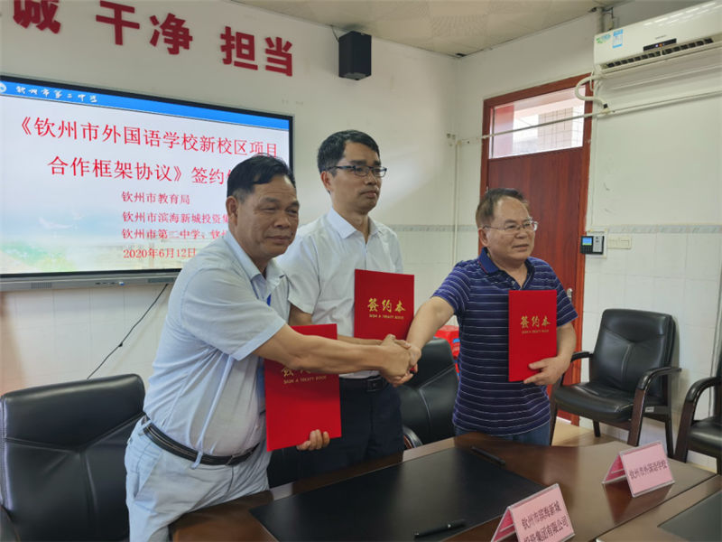 6月12日,我集團公司與欽州市第二中學、市外國語學校合作項目——欽州市外國語學校新校區的合作簽約儀式在欽州市隆重舉行。簽約儀式上,集團公司副總經理劉一材、欽州市第二中學校長劉世偉及市外國語學校法人代表謝立作為三方代表簽署了《欽州市外國語學校新校區項目合作框架協議》,并合影留念。