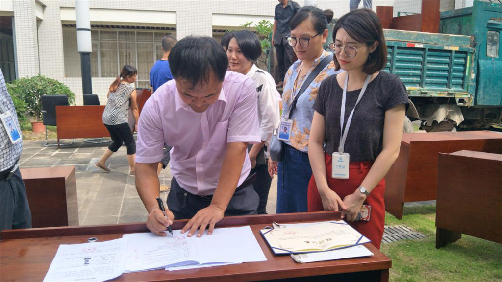 7月18日上午9:30,我集團公司向欽州市初心公益協會贈與一批辦公桌椅,用于解決分界村民服務中心樓新時代講習所桌椅短缺問題。 (圖為:我集團公司代表簽字) (圖為:對方代表簽字) (圖為:搬運辦公桌椅)