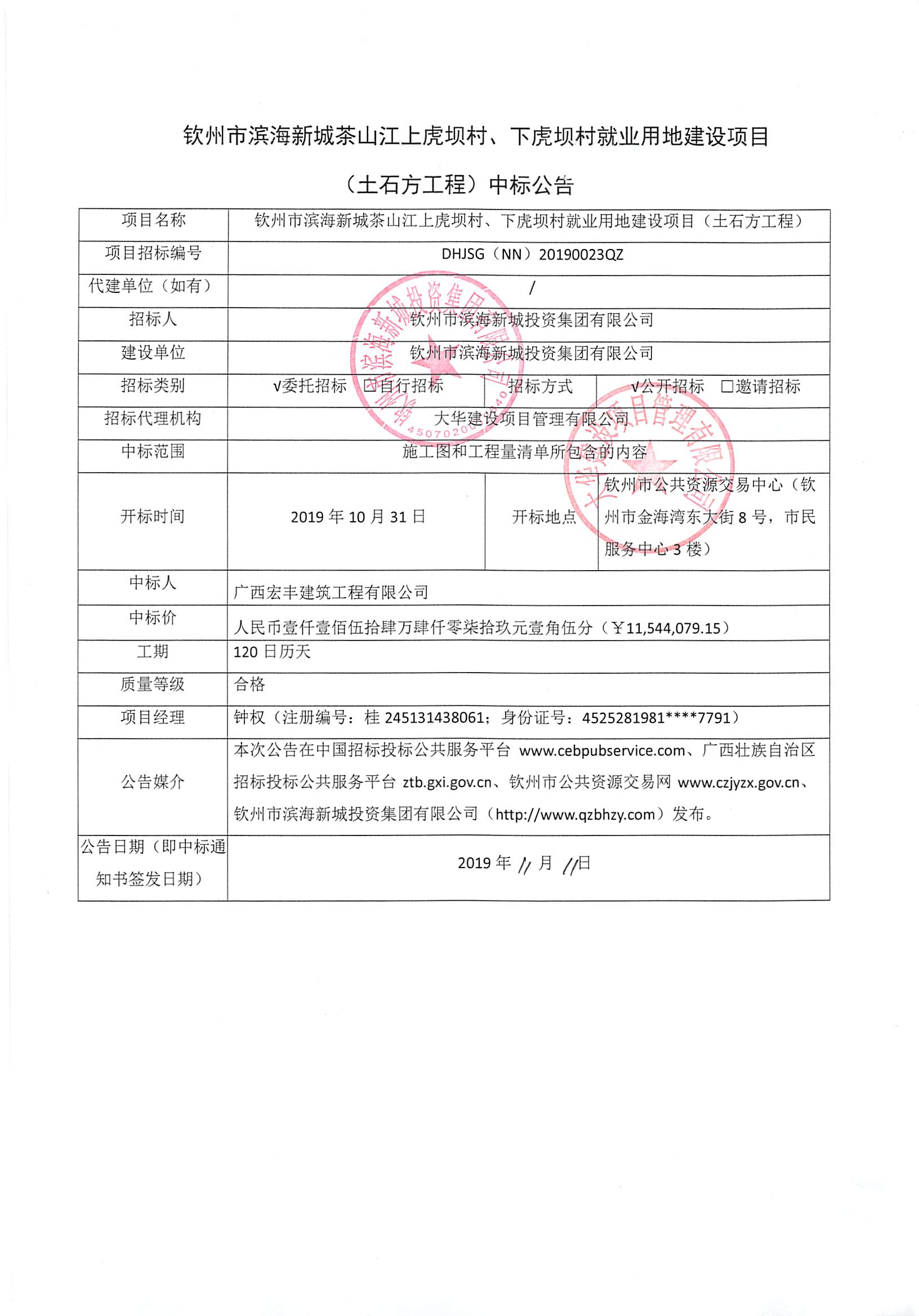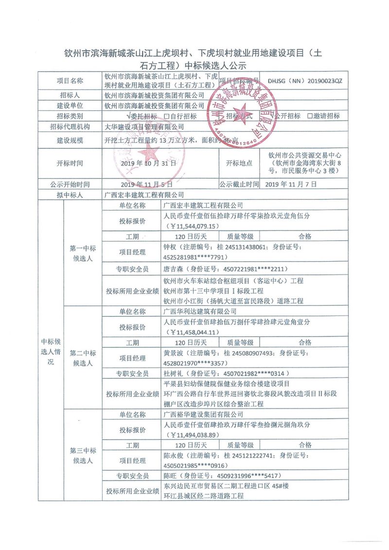 欽州市濱海新城茶山江上虎壩村、下虎壩村就業用地建設項目(土石方工程)中標公示