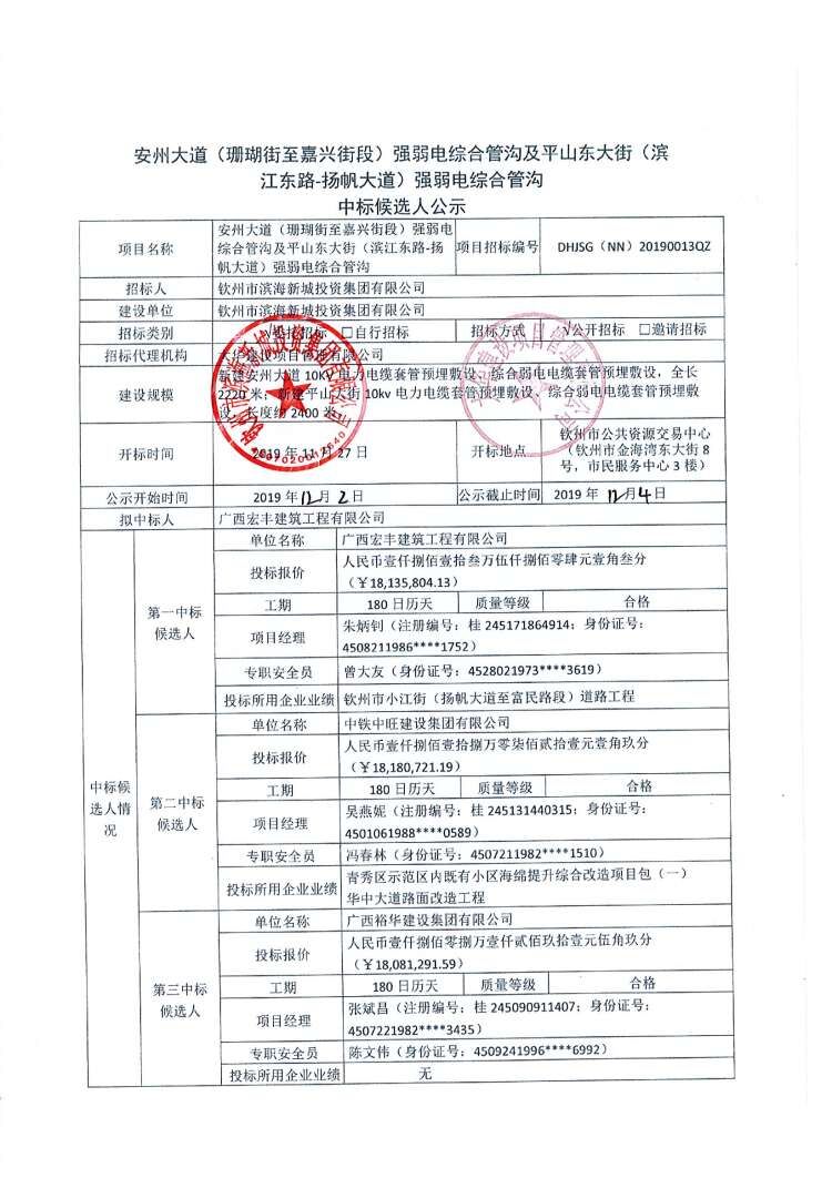 欽州市濱海新城嘉興街(嘉禾街-揚帆大道)道路工程及嘉興街(揚帆大道-安州大道)地下綜合管廊項目中標候選人公示