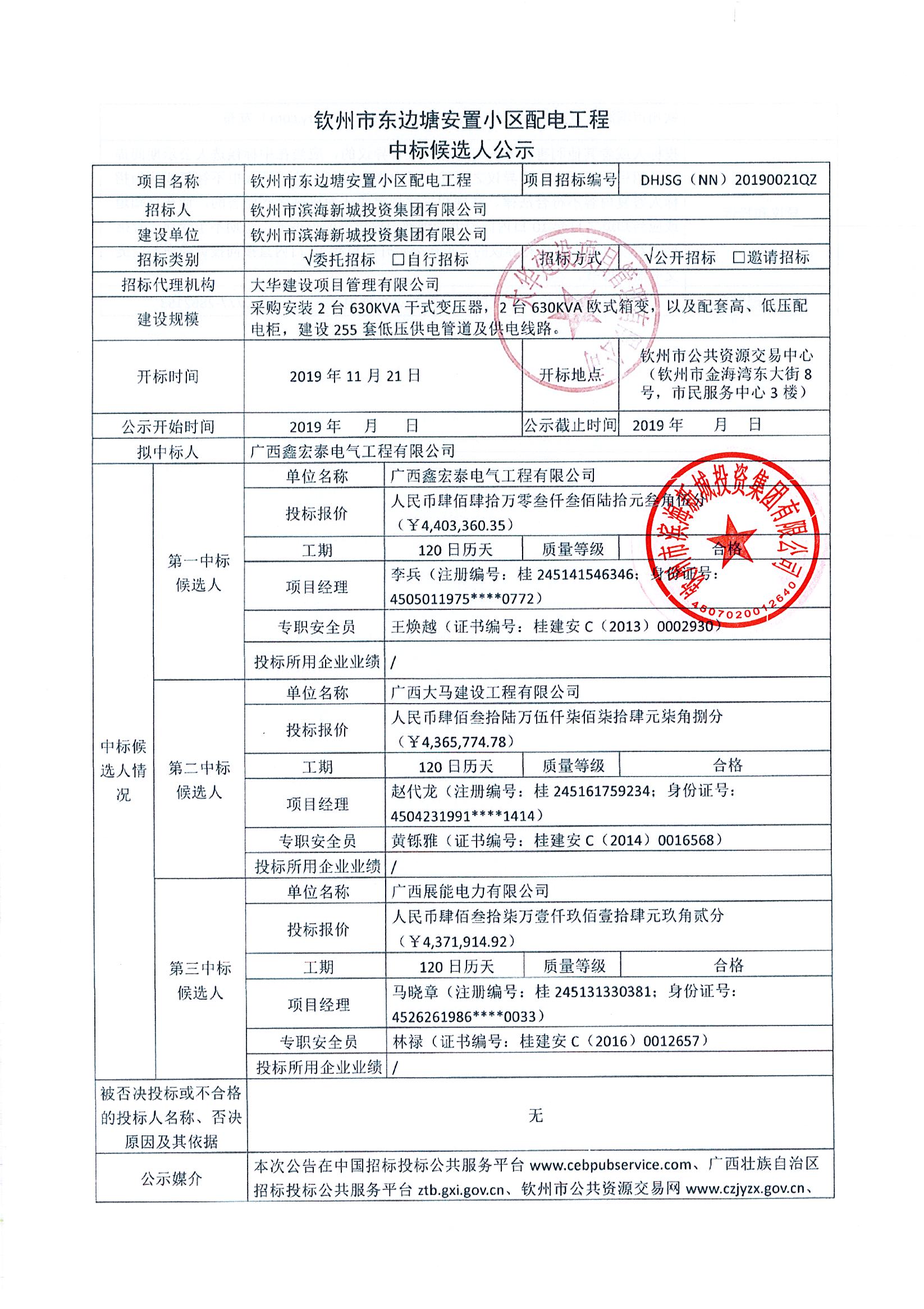 欽州市東邊塘安置小區配電工程中標候選人公示