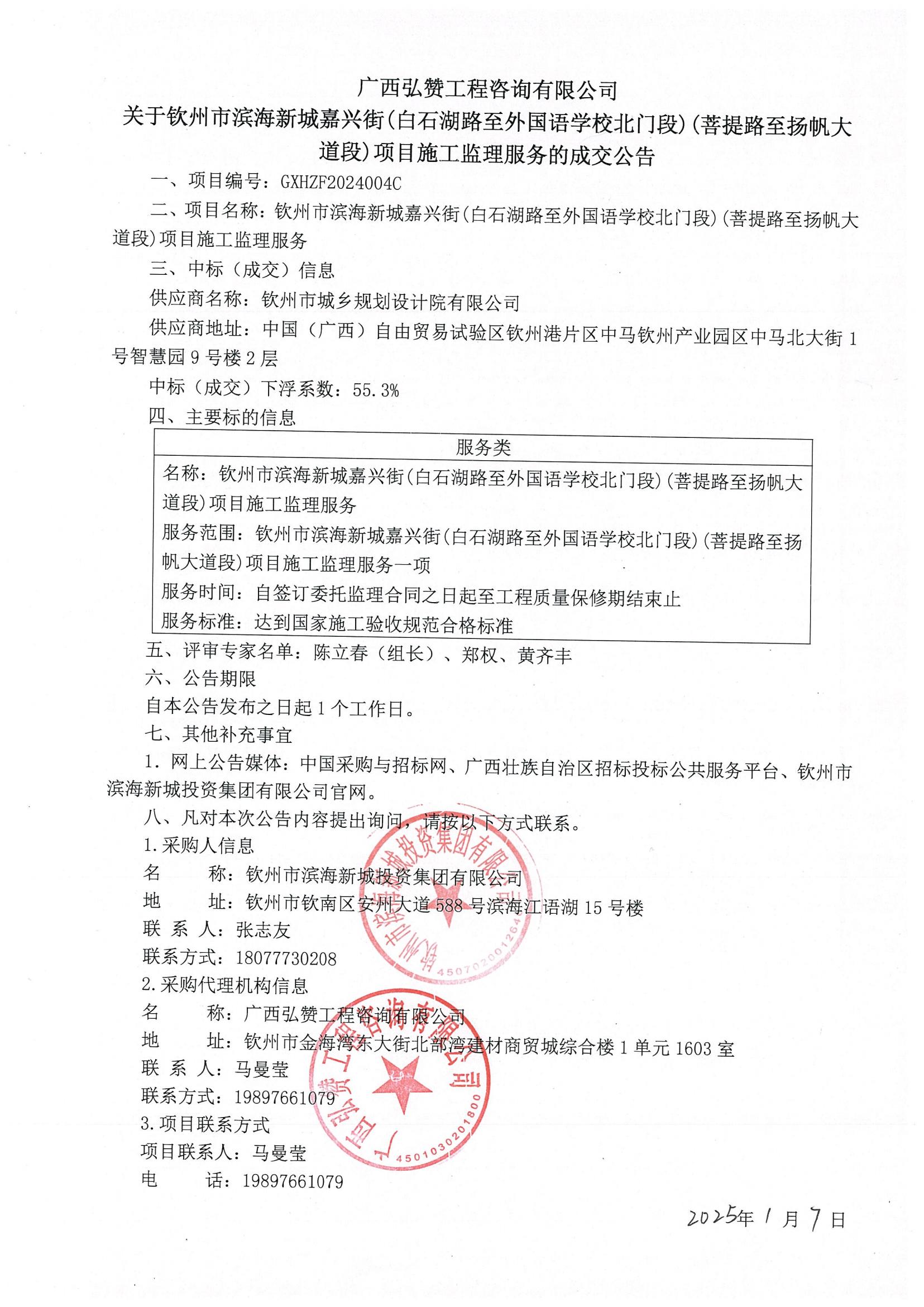 廣西弘贊工程咨詢有限公司關于欽州市濱海新城嘉興街(白石湖路至外國語學校北門段)(菩提路至揚帆大道段)項目施工監理服務的成交公告