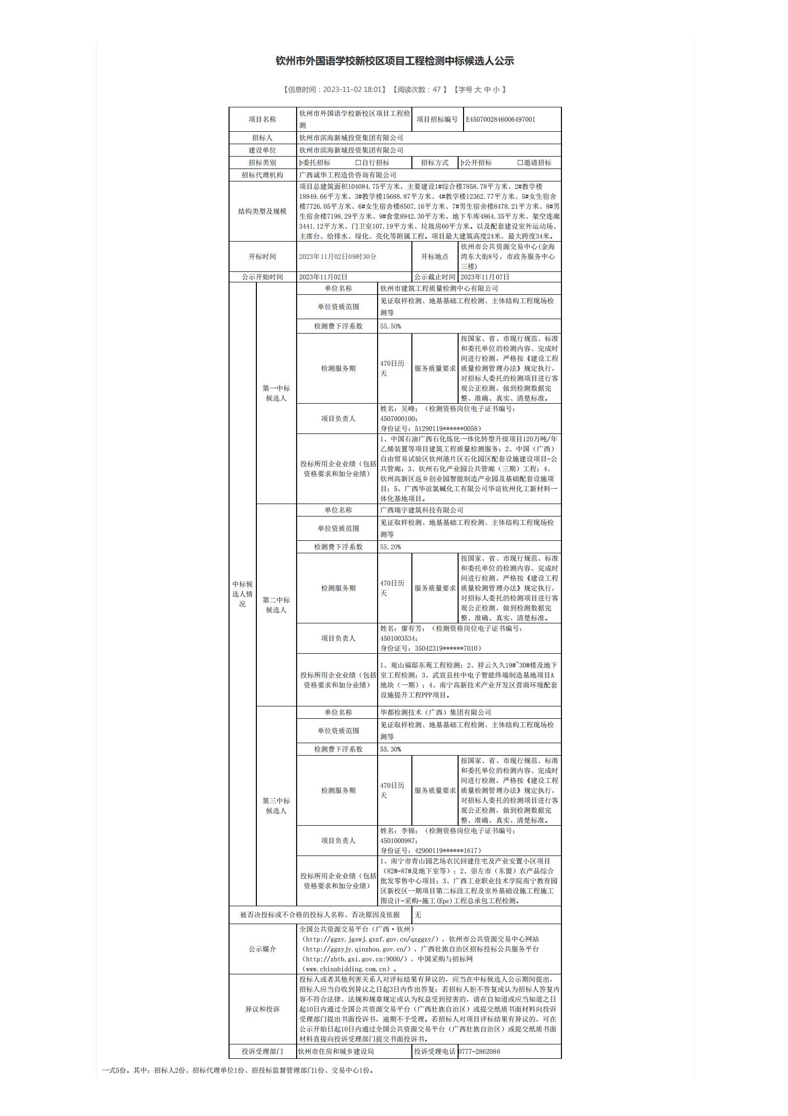 欽州市外國語學校新校區項目工程檢測中標候選人公示