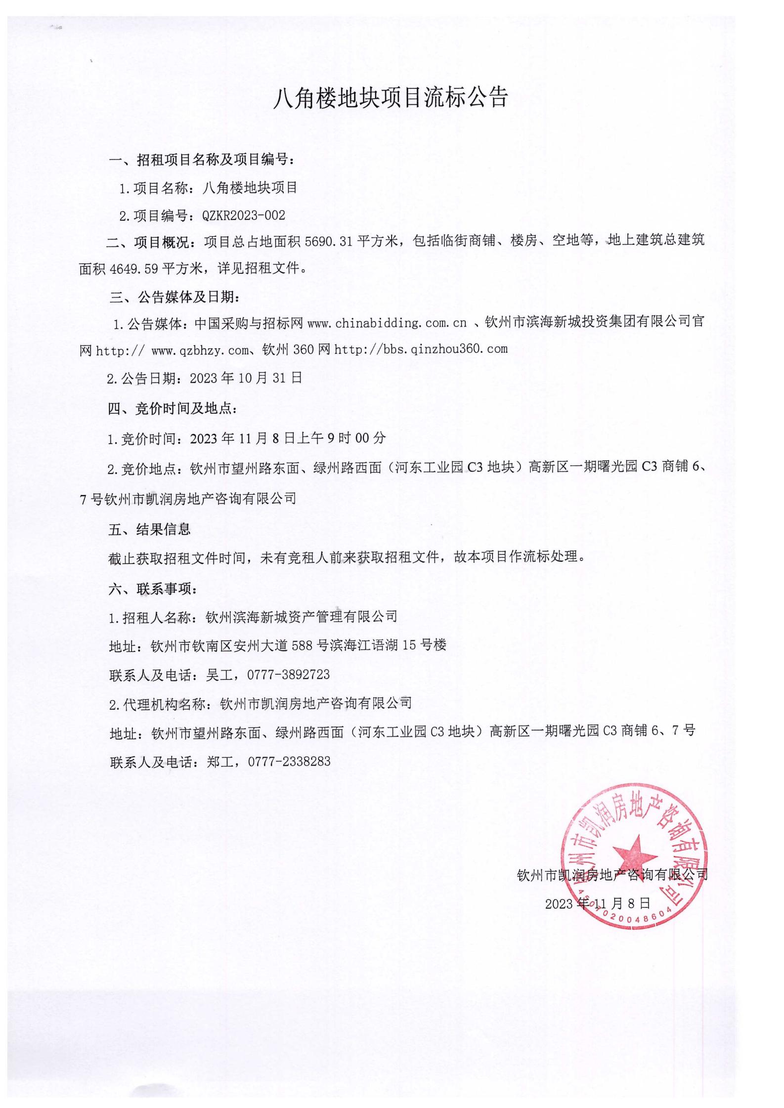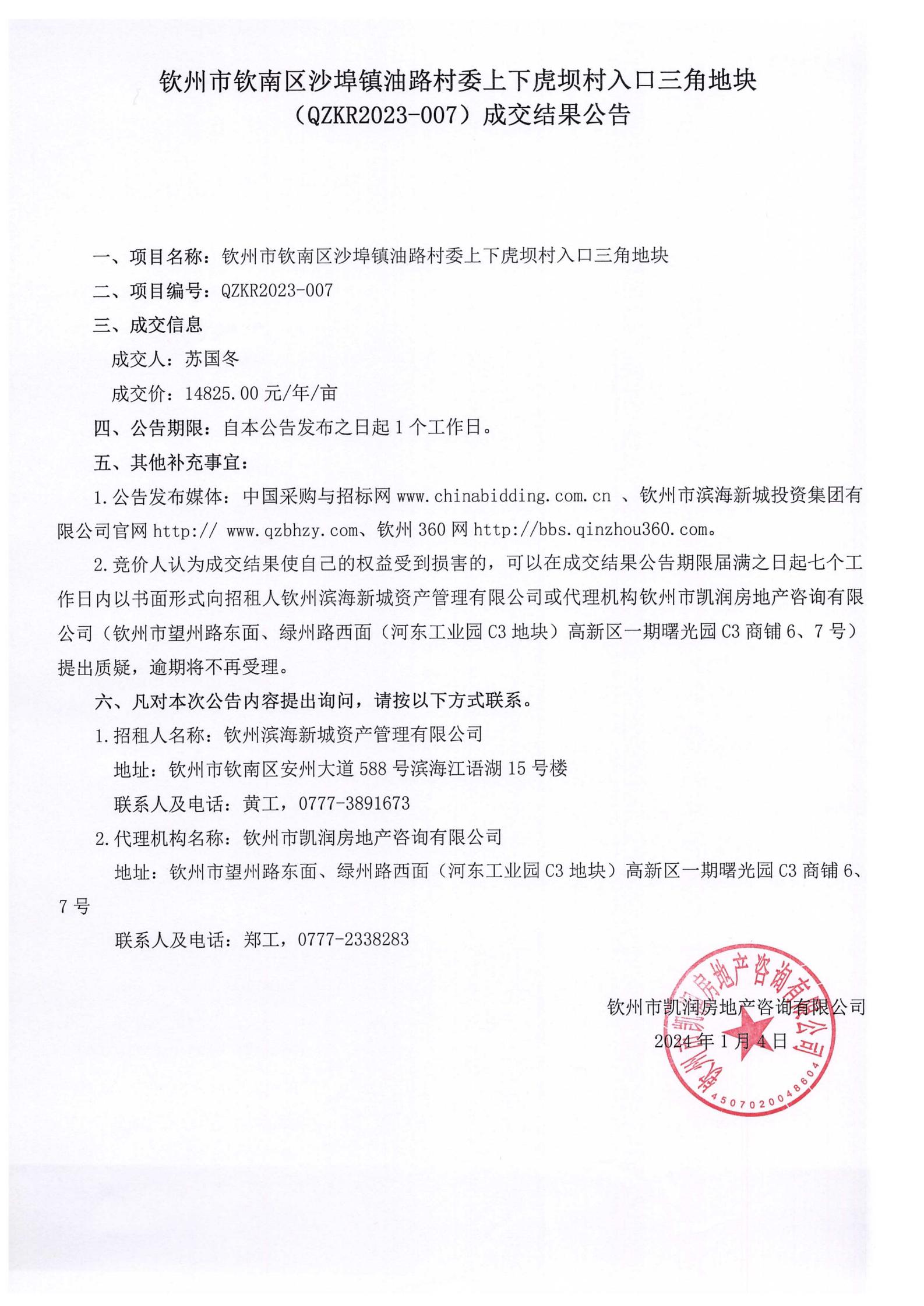 欽州市欽南區沙埠鎮油路村委上下虎壩村入口三角地塊〔QZKR2023-007(重)〕成交結果公告