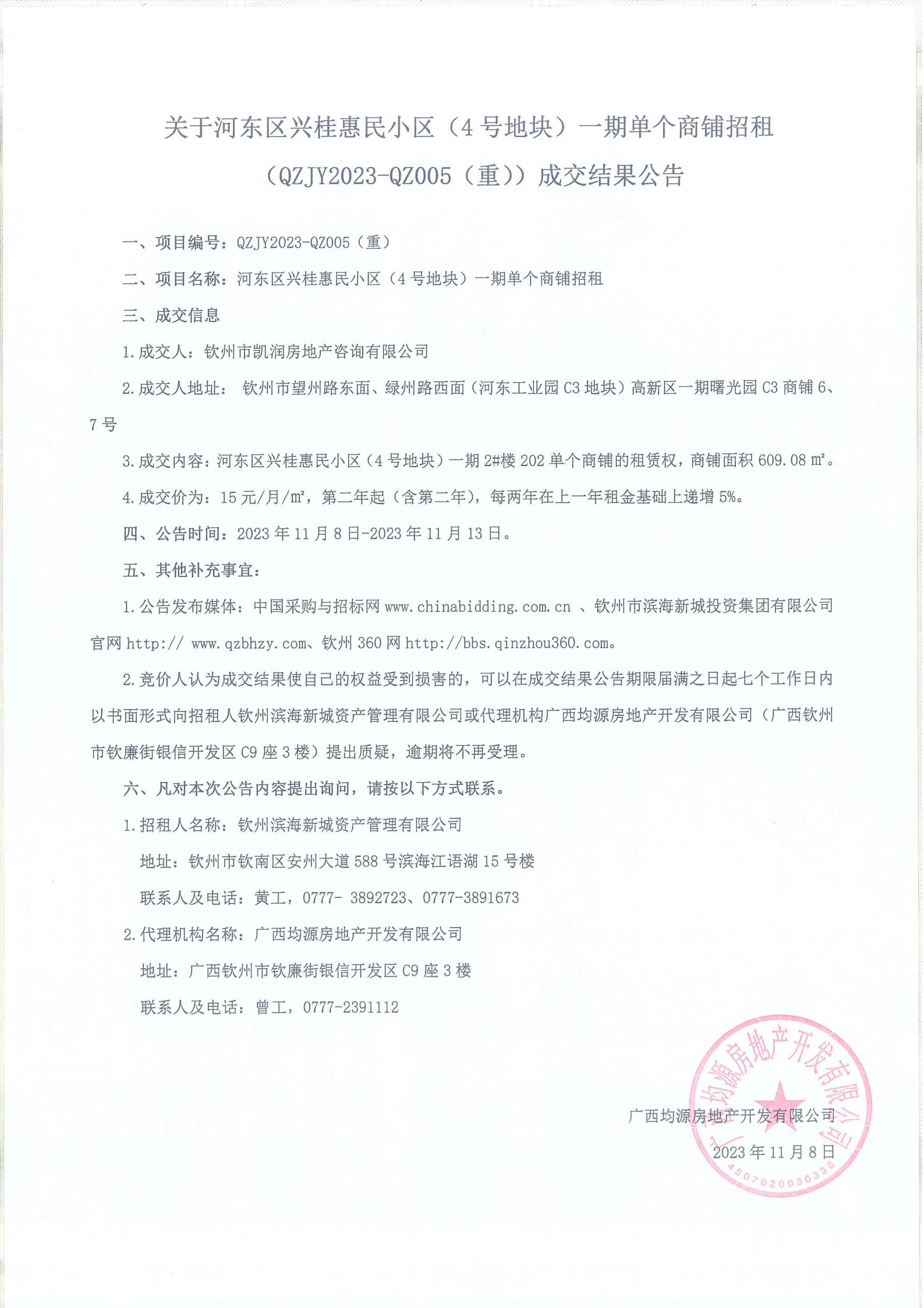 河東區興桂惠民小區(4號地塊)一期單個商鋪招租(qzjy2023-qz005(重))成交結果公告