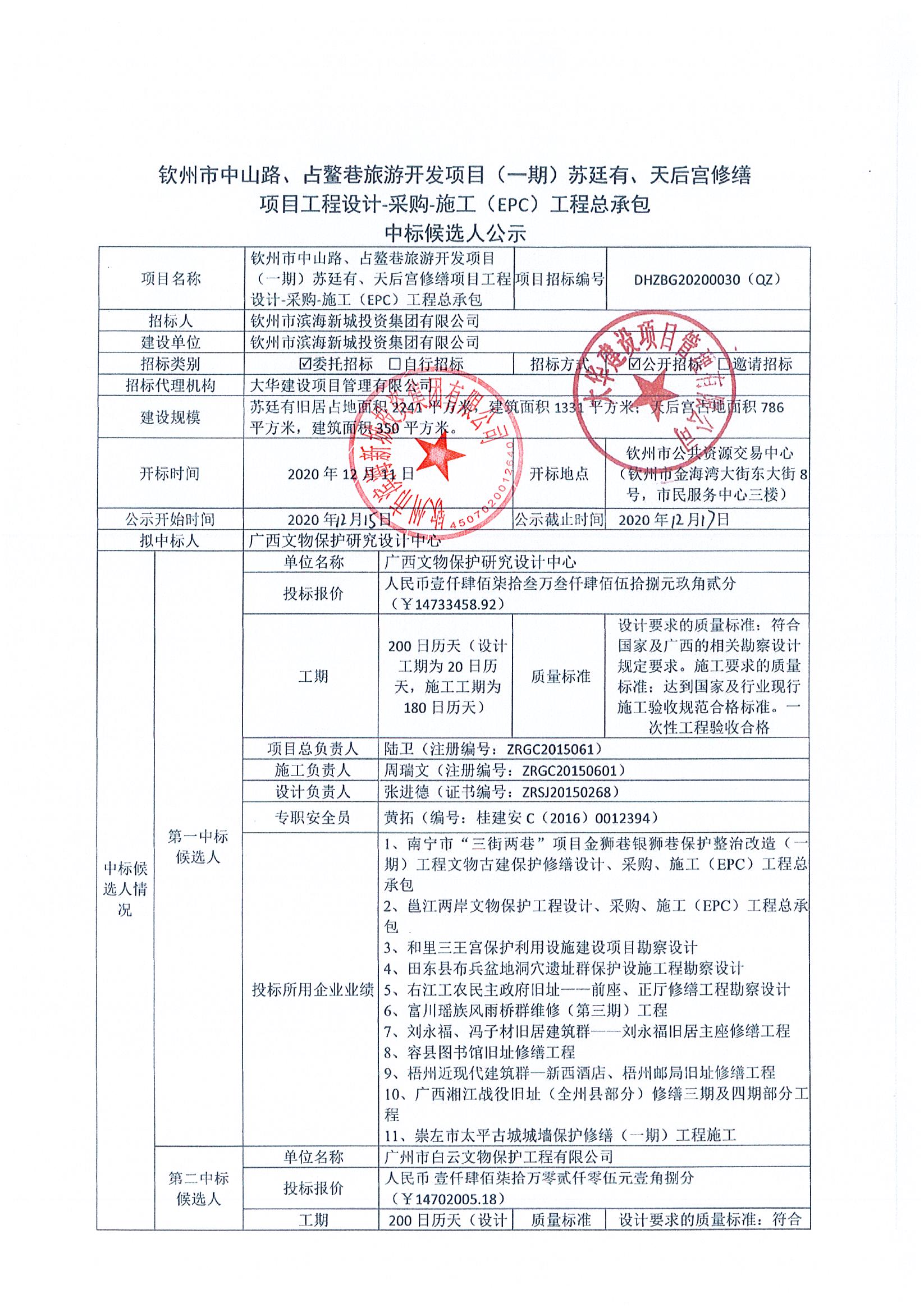 中標(biāo)公示-欽州市中山路、占鰲巷旅游開發(fā)項目(一期)蘇廷有、天后宮修繕項目工程設(shè)計-采購-施工(EPC)工程總承包中標(biāo)公告
