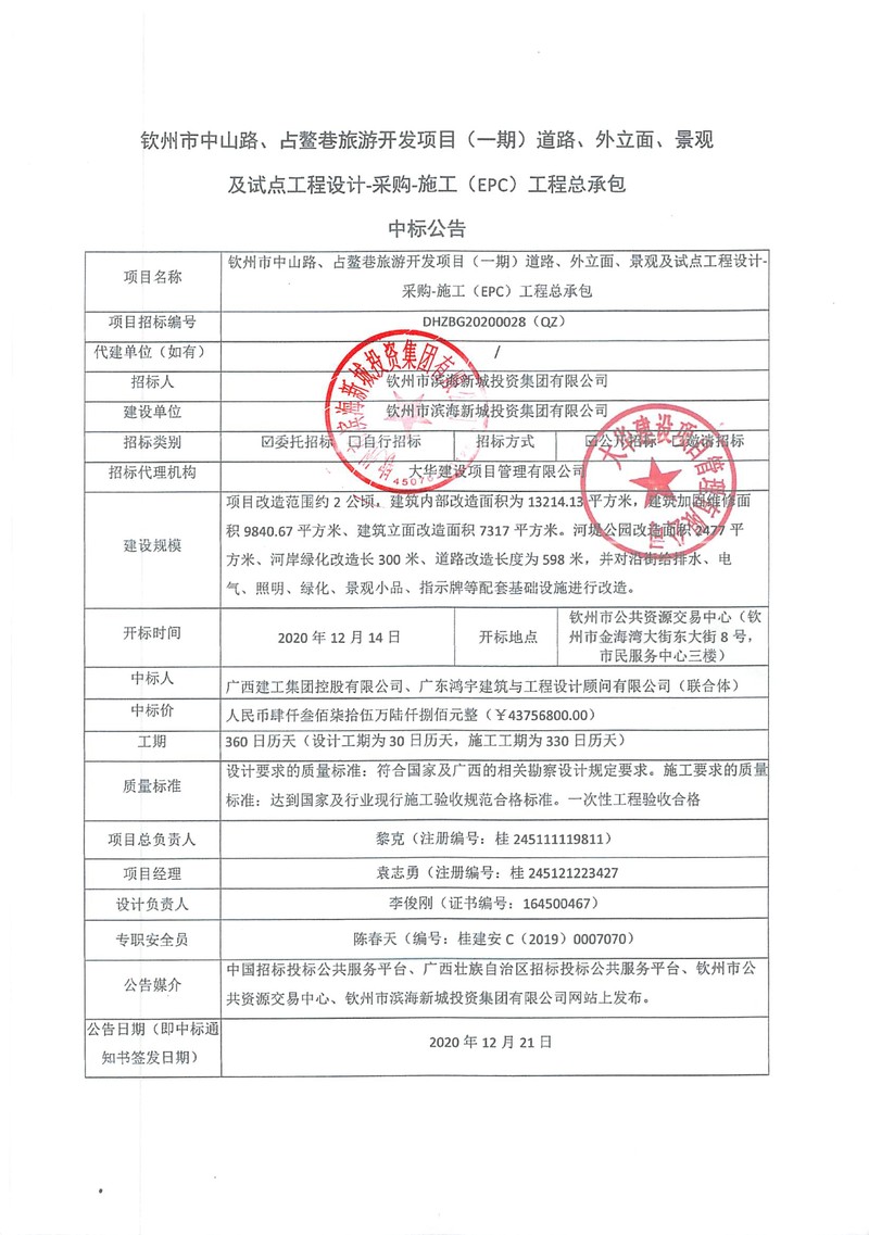中標(biāo)公示-欽州市中山路、占鰲巷旅游開發(fā)項目(一期)道路、外立面、景觀及試點工程設(shè)計-采購-施工(EPC)工程總承包中標(biāo)公告
