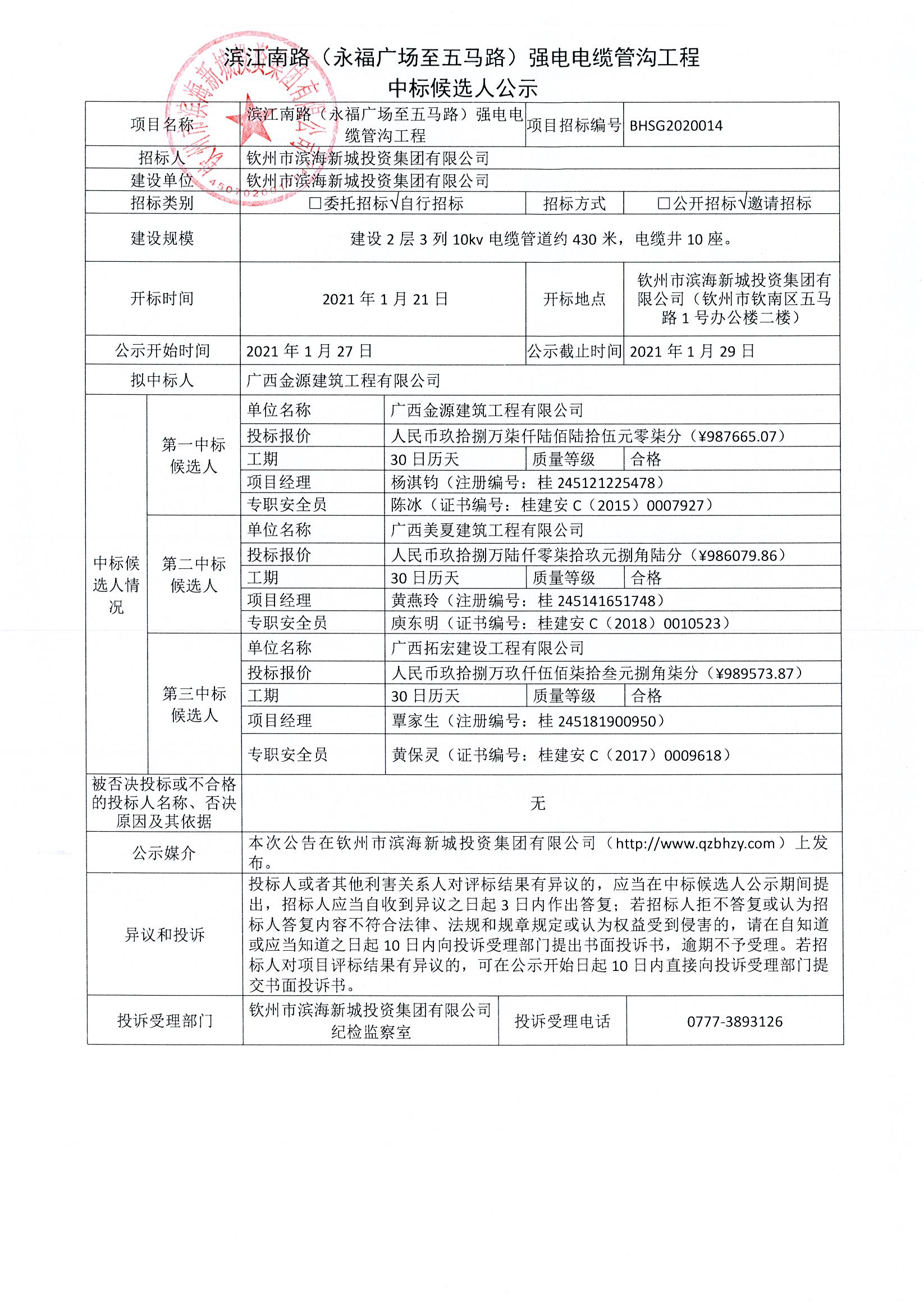 濱江南路(永福廣場至五馬路)強電電纜管溝工程中標(biāo)候選人公示