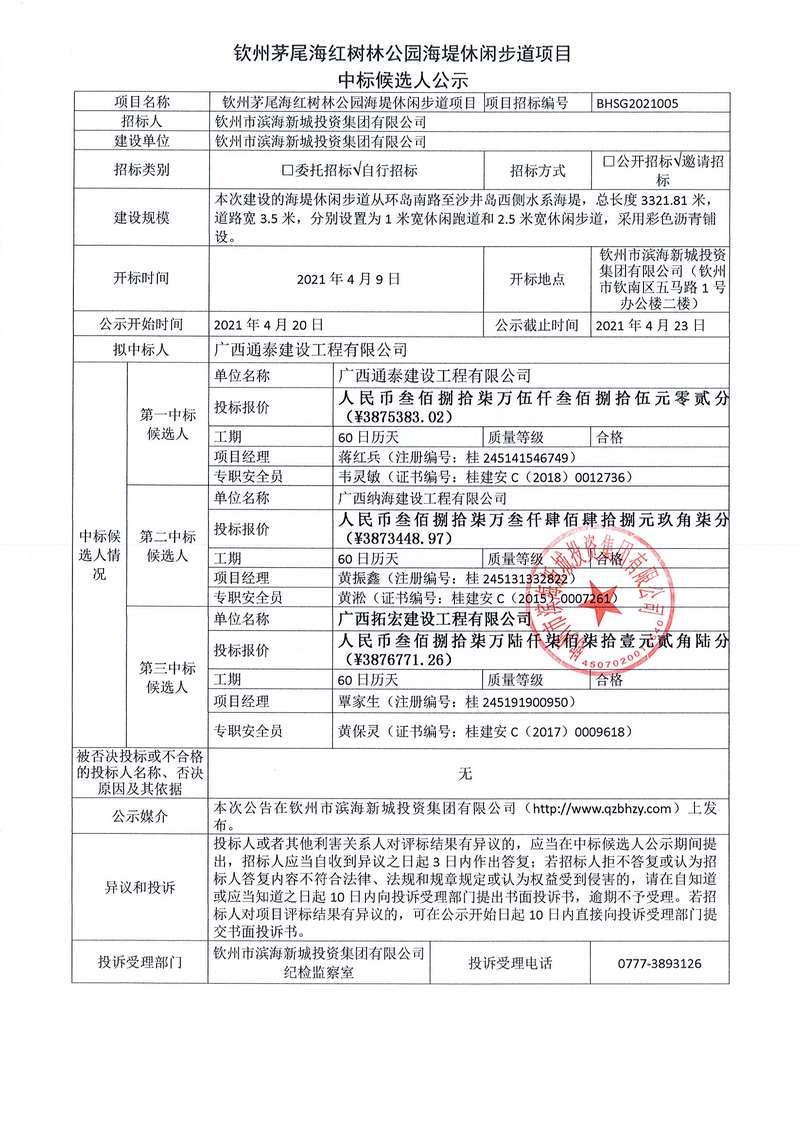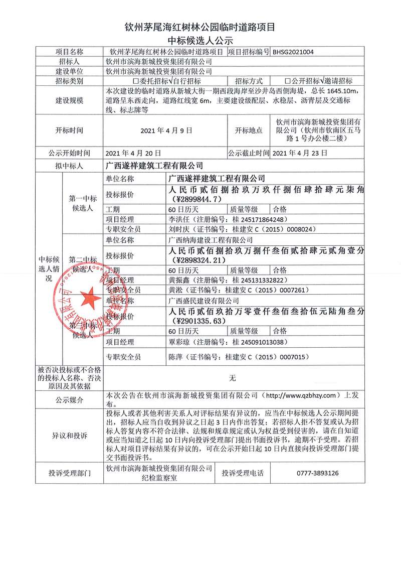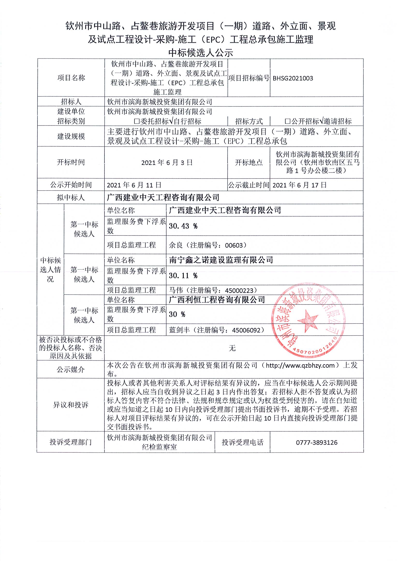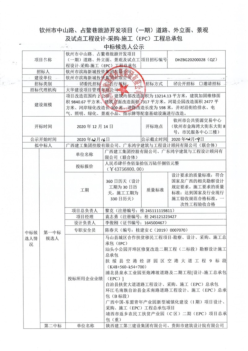 欽州市中山路、占鰲巷旅游開發(fā)項目(一期)道路、外立面、景觀及試點工程設(shè)計-采購-施工(EPC)工程總承包中標(biāo)候選人公示