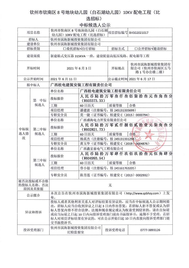 欽州市欽南區(qū)8號地塊幼兒園(白石湖幼兒園)10KV配電工程中標(biāo)公示
