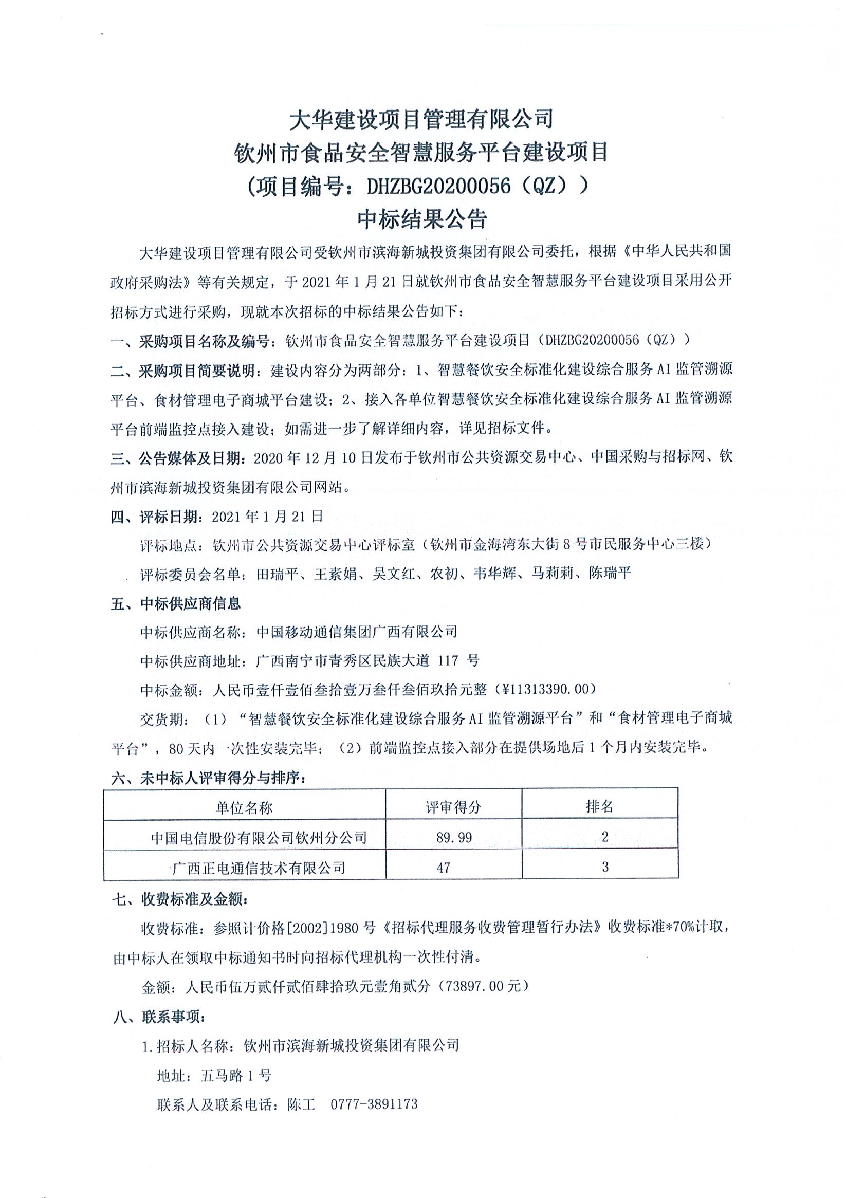 欽州市食品安全智慧服務(wù)平臺建設(shè)項目中標(biāo)結(jié)果公告