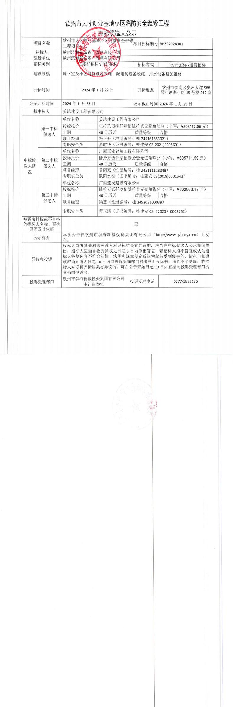 欽州市人才創業基地小區消防安全維修工程中標候選人公示