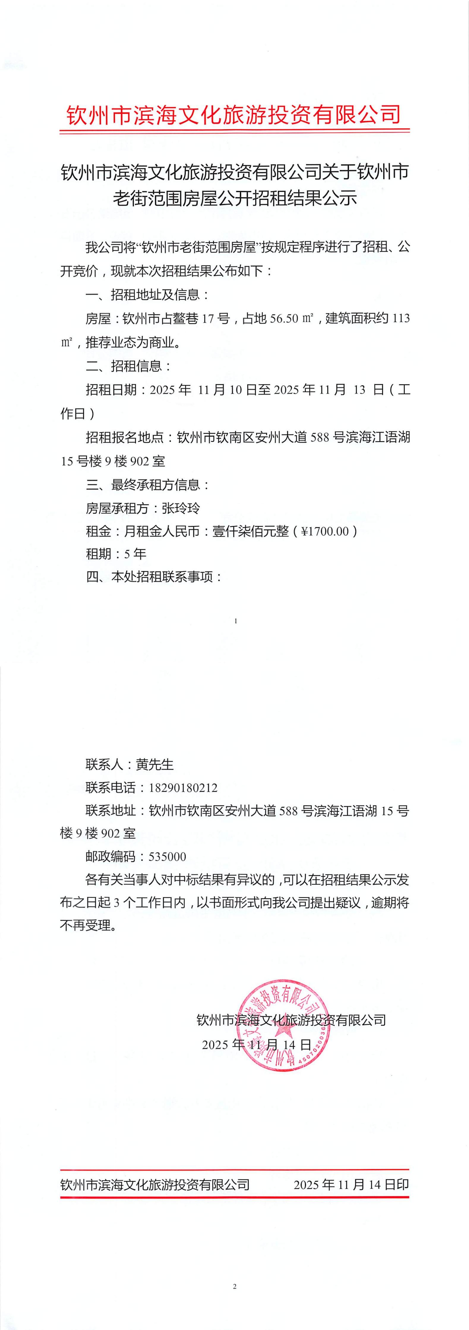 關于欽州市老街范圍房屋公開招租結果公示(占鰲巷17號)
