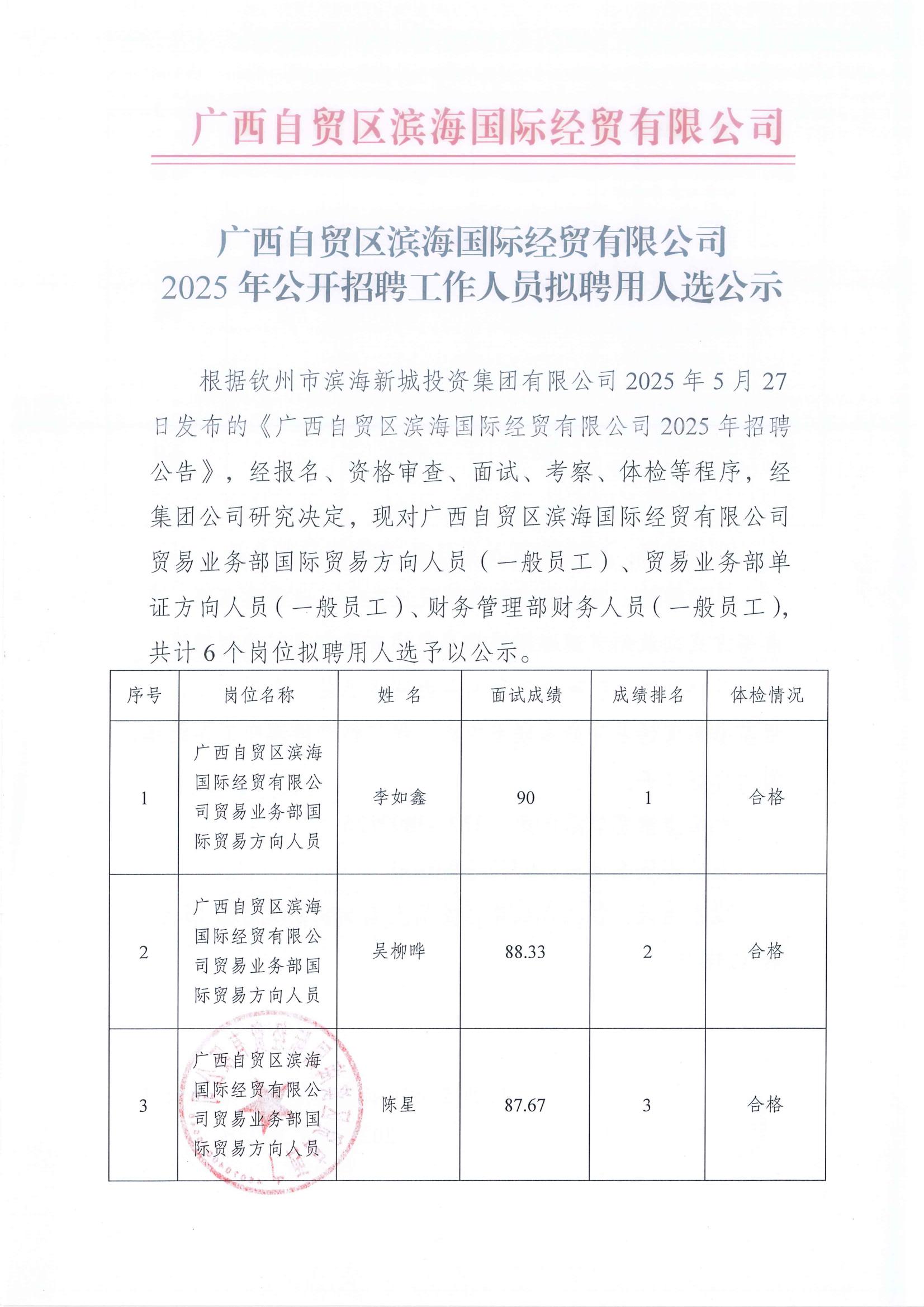 • 廣西自貿區濱海國際經貿有限公司2025年公開招聘工作人員擬聘用人選公示