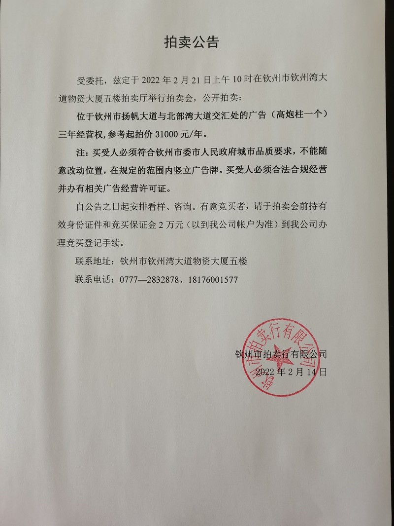 拍賣公告(揚帆大道與北部灣大道交匯處廣告經營權)