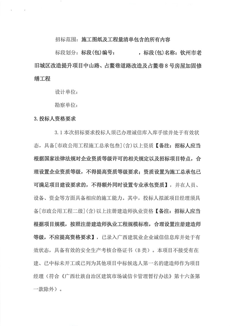 招標公告 -欽州市老舊城區改造提升項目占鰲巷沿線房屋外立面修繕工程