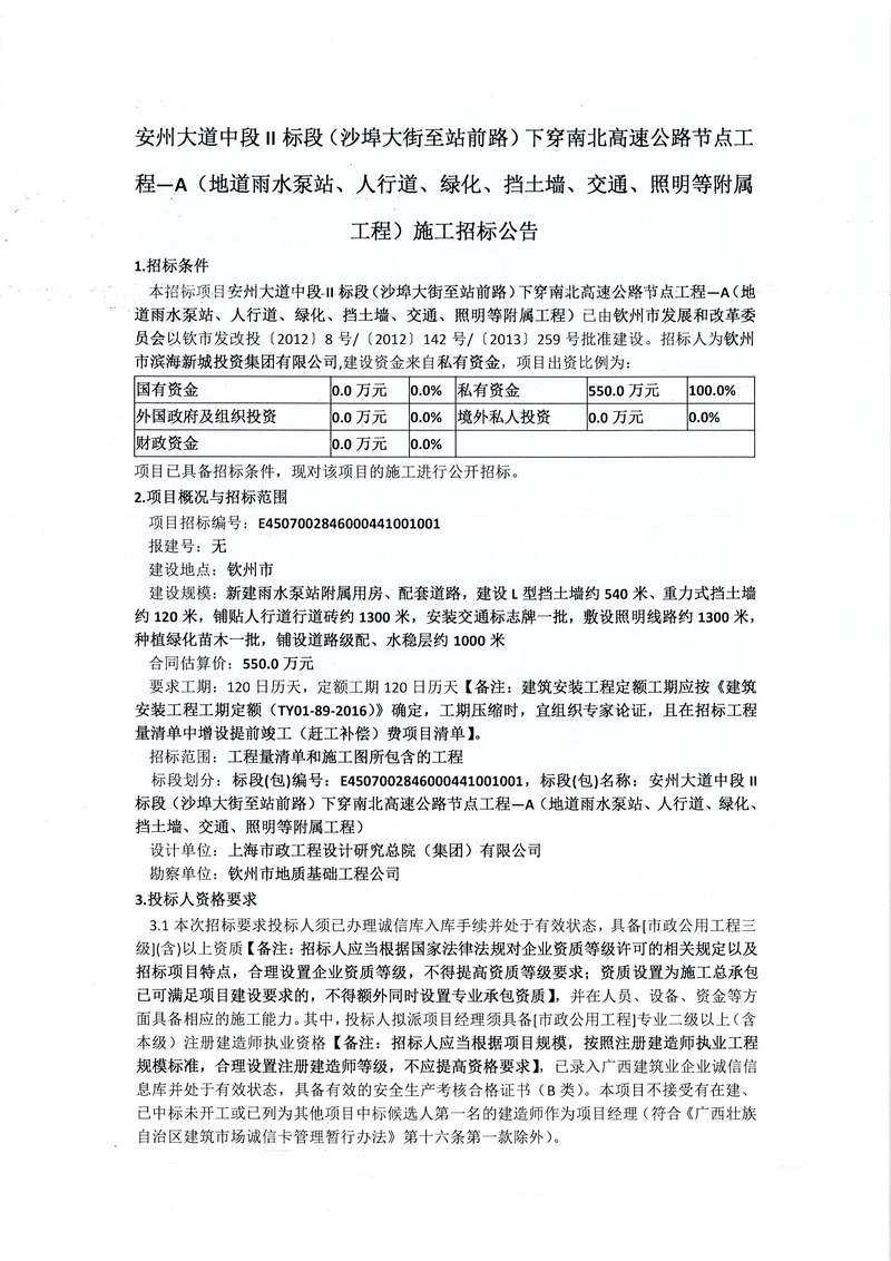 安州大道中段II標段(沙埠大街至站前路)下穿南北高速公路節點工程—A(地道雨水泵站、人行道、綠化、擋土墻、交通、照明等附屬工程)施工招標公告