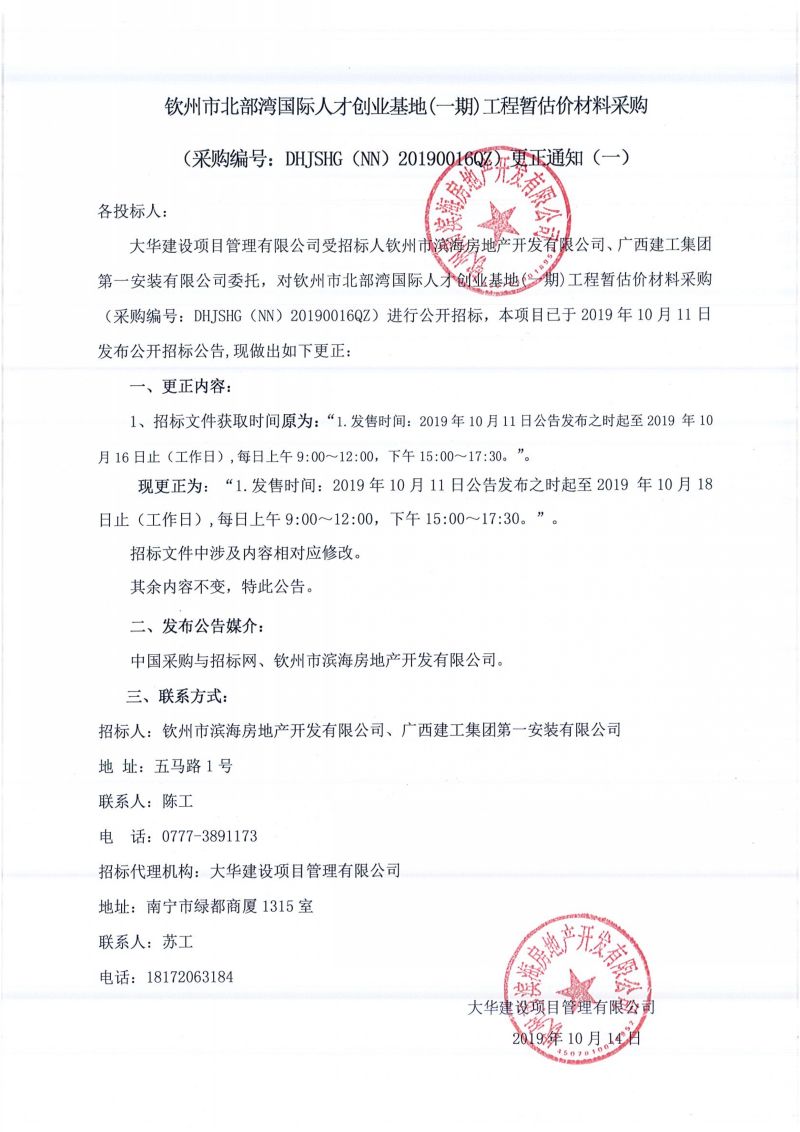 欽州市北部灣國際人才創業基地(一期)工程暫估價材料采購更正通知(一)