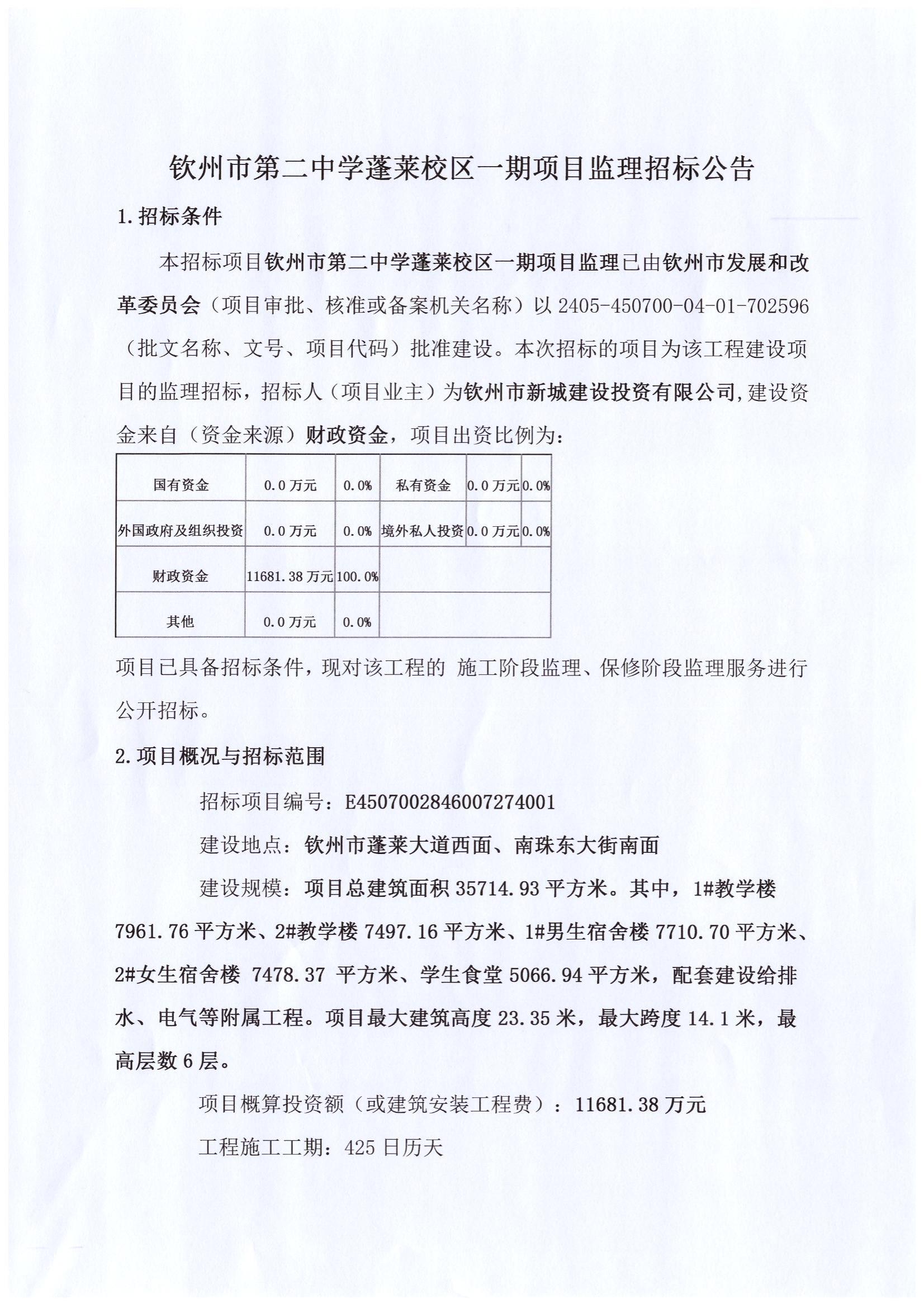 欽州市第二中學蓬萊校區一期項目監理招標公告