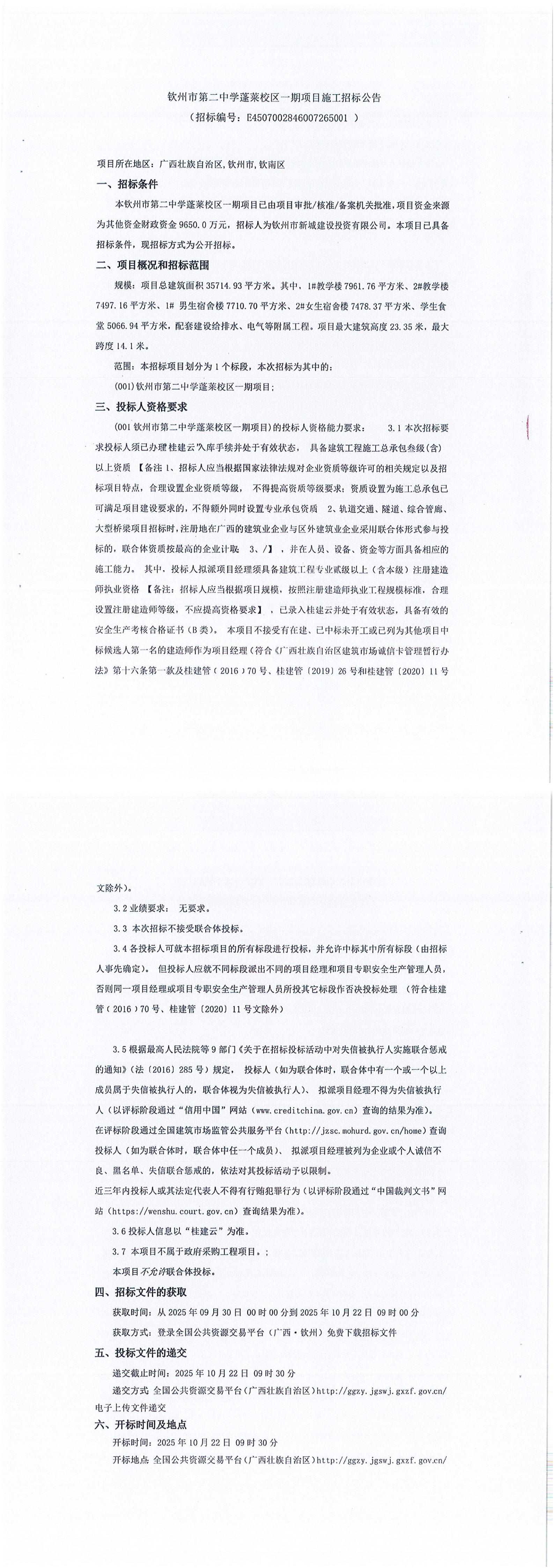 欽州市第二中學蓬萊校區一期項目(項目招標編號:E4507002846007265001)更正公告(二)