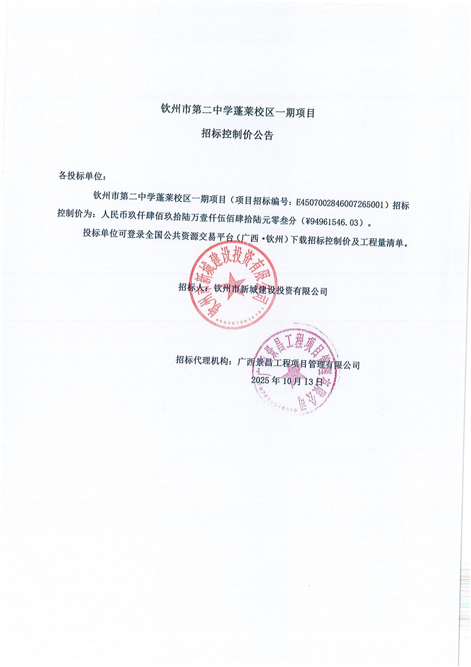 欽州市第二中學蓬萊校區一期項目招標控制價公告