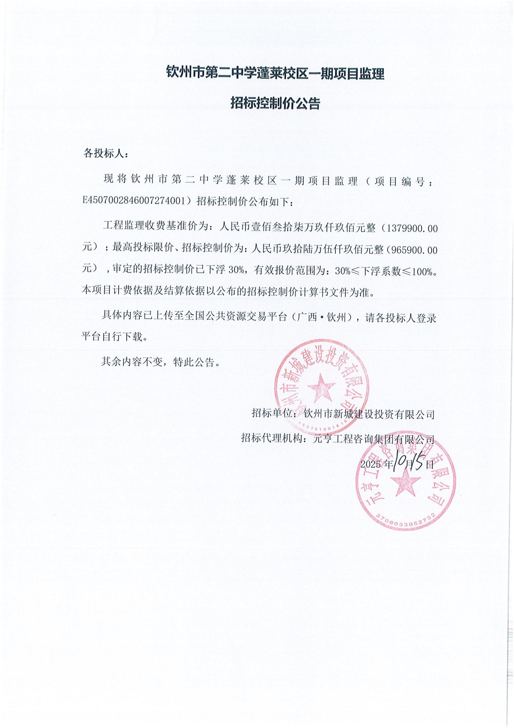 欽州市第二中學蓬萊校區一期項目監理招標控制價公告
