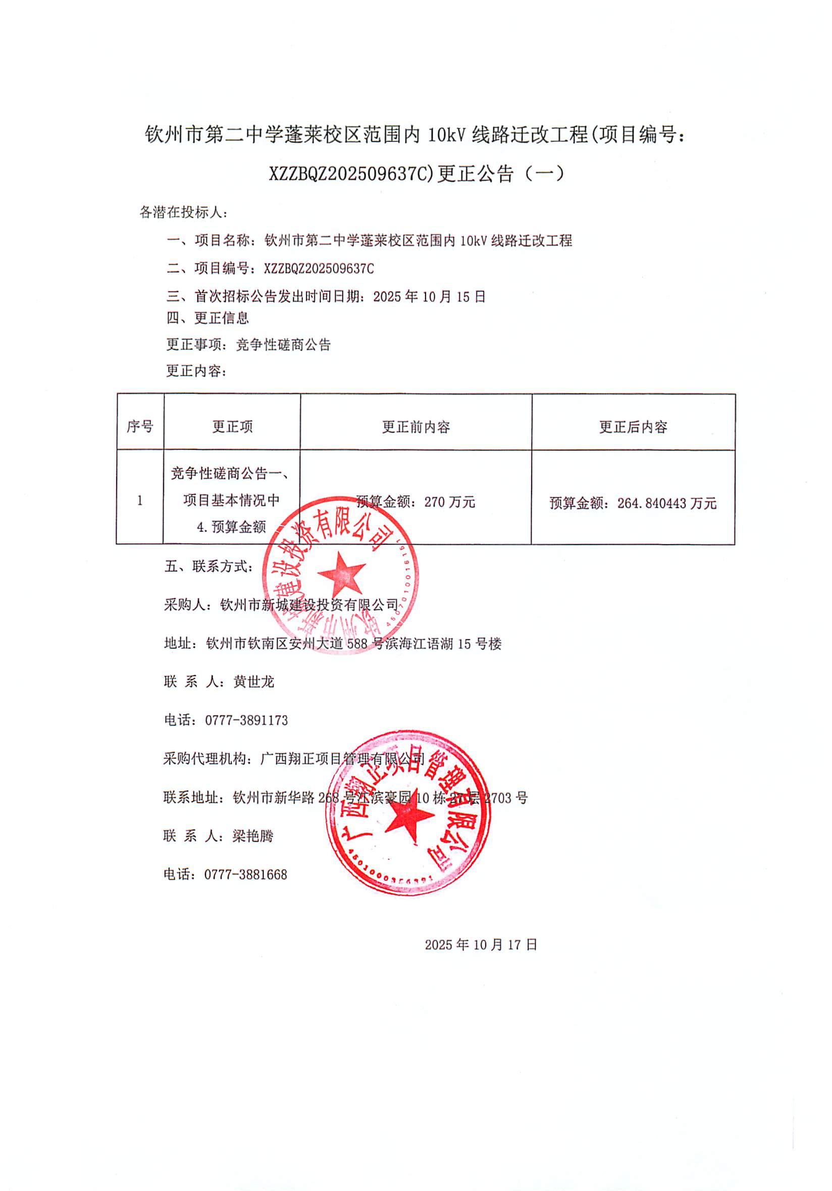 欽州市第二中學蓬萊校區范圍內10kV線路遷改工程(項目編號: XZZBQZ202509637C)更正公告(一)