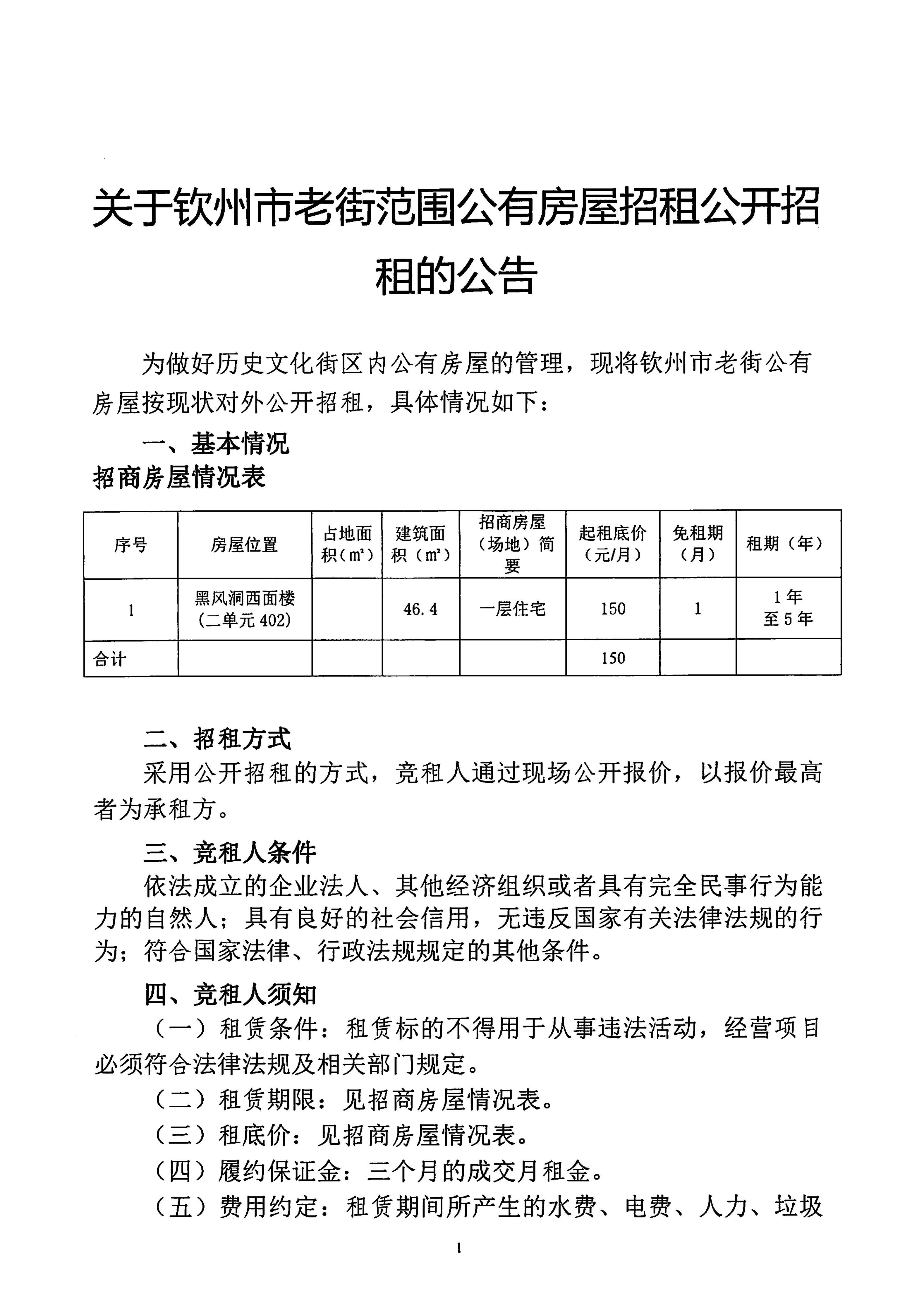 關于欽州市老街范圍公有房屋招租公開招租的公告(黑風洞西面樓二單元402)