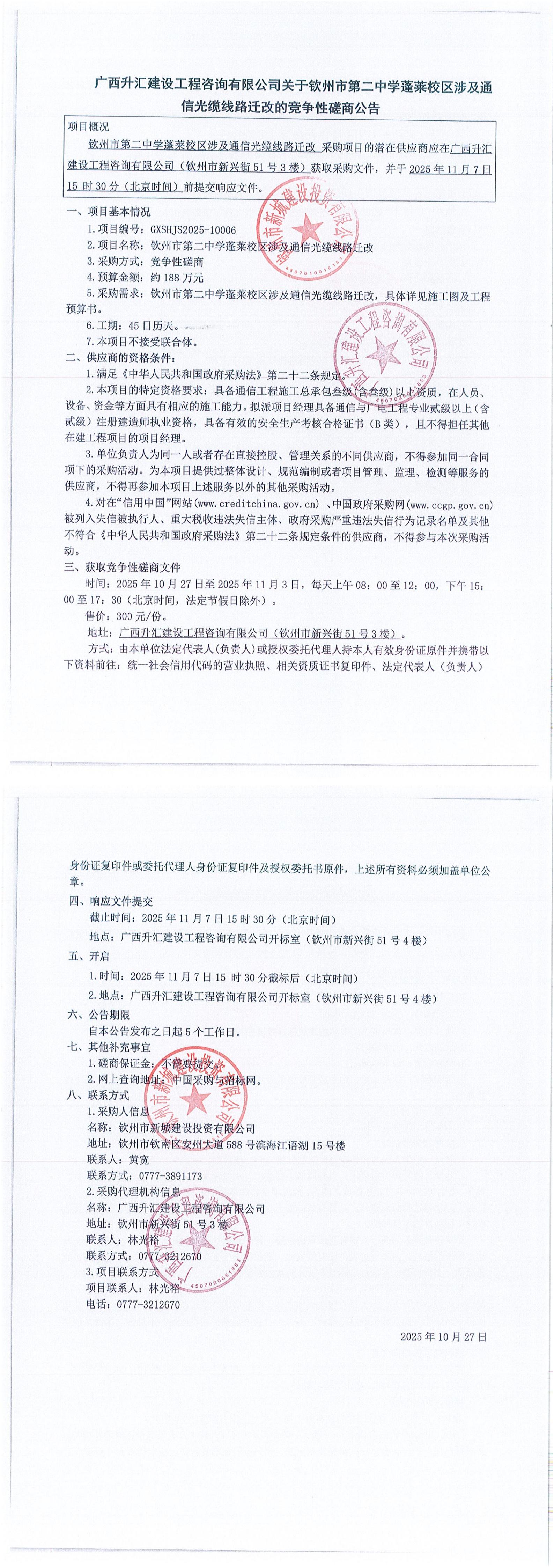 欽州市第二中學蓬萊校區涉及通信光纜線路遷改(項目編號: GXSHJS2025-10006)更正公告(二)