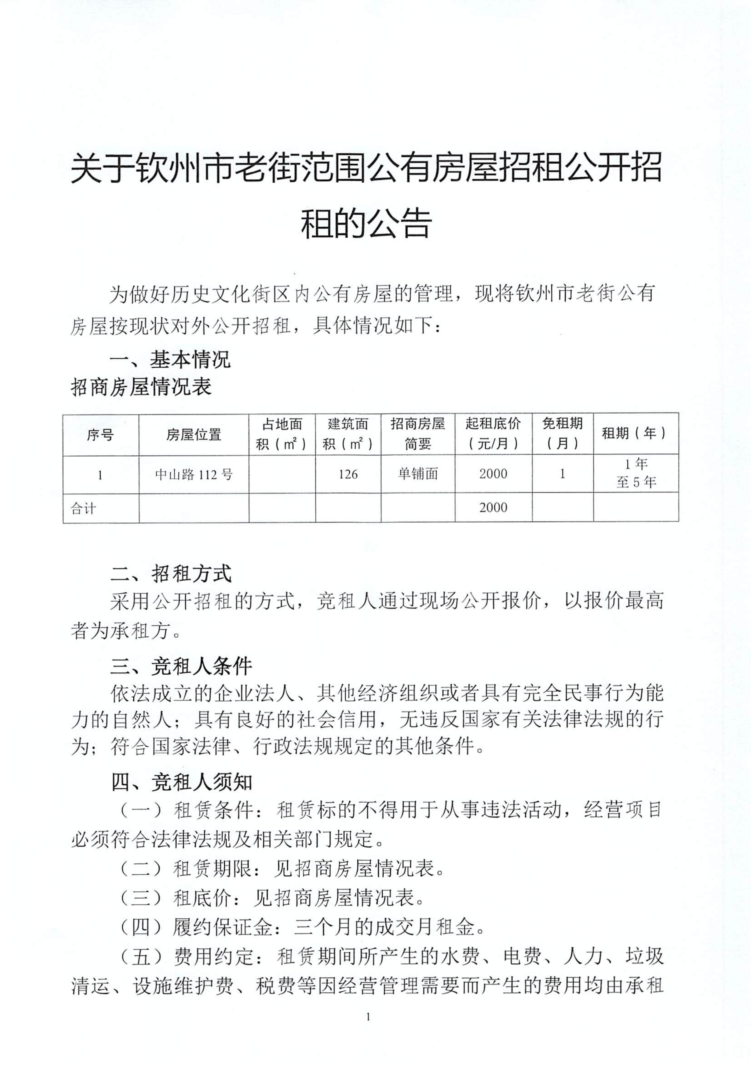 關于欽州市老街范圍公有房屋招租公開招租的公告