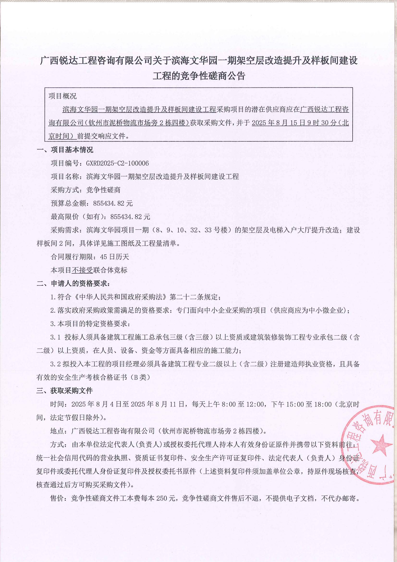 廣西銳達工程咨詢有限公司關于濱海文華園一期架空層改造提升及樣板間建設工程的競爭性磋商公告