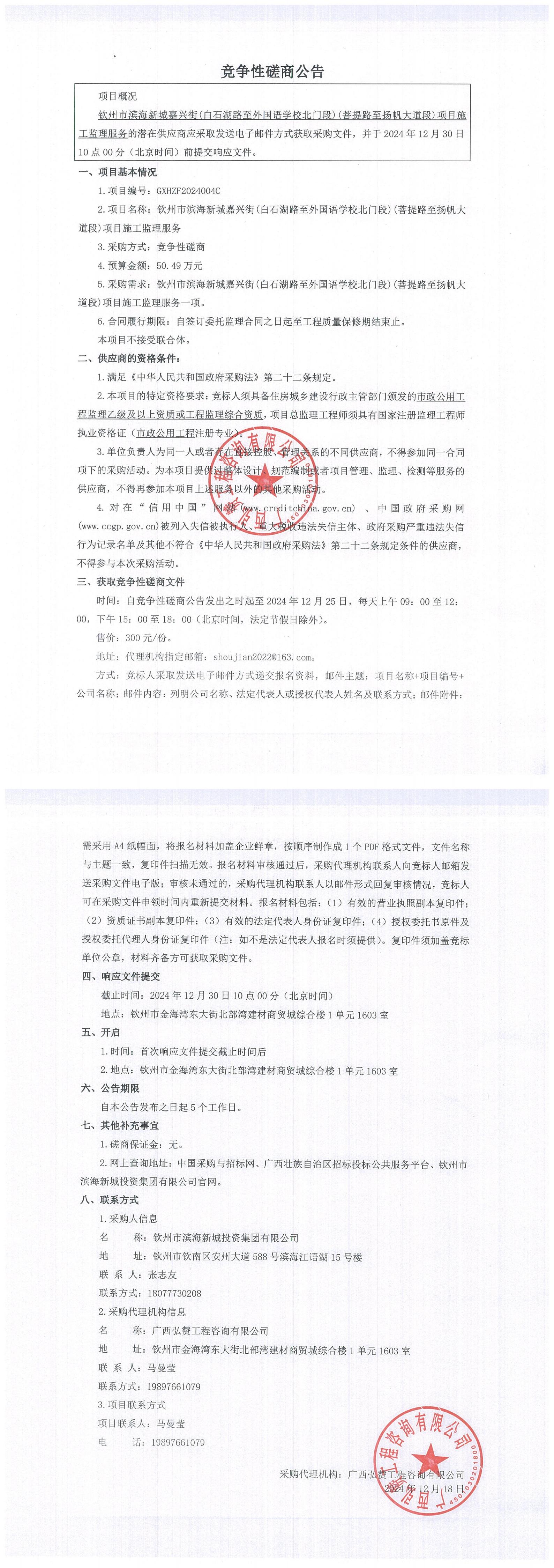 競爭性磋商公告(欽州市濱海新城嘉興街(白石湖路至外國語學校北門段)(菩提路至揚帆大道段)項目施工監理服務)