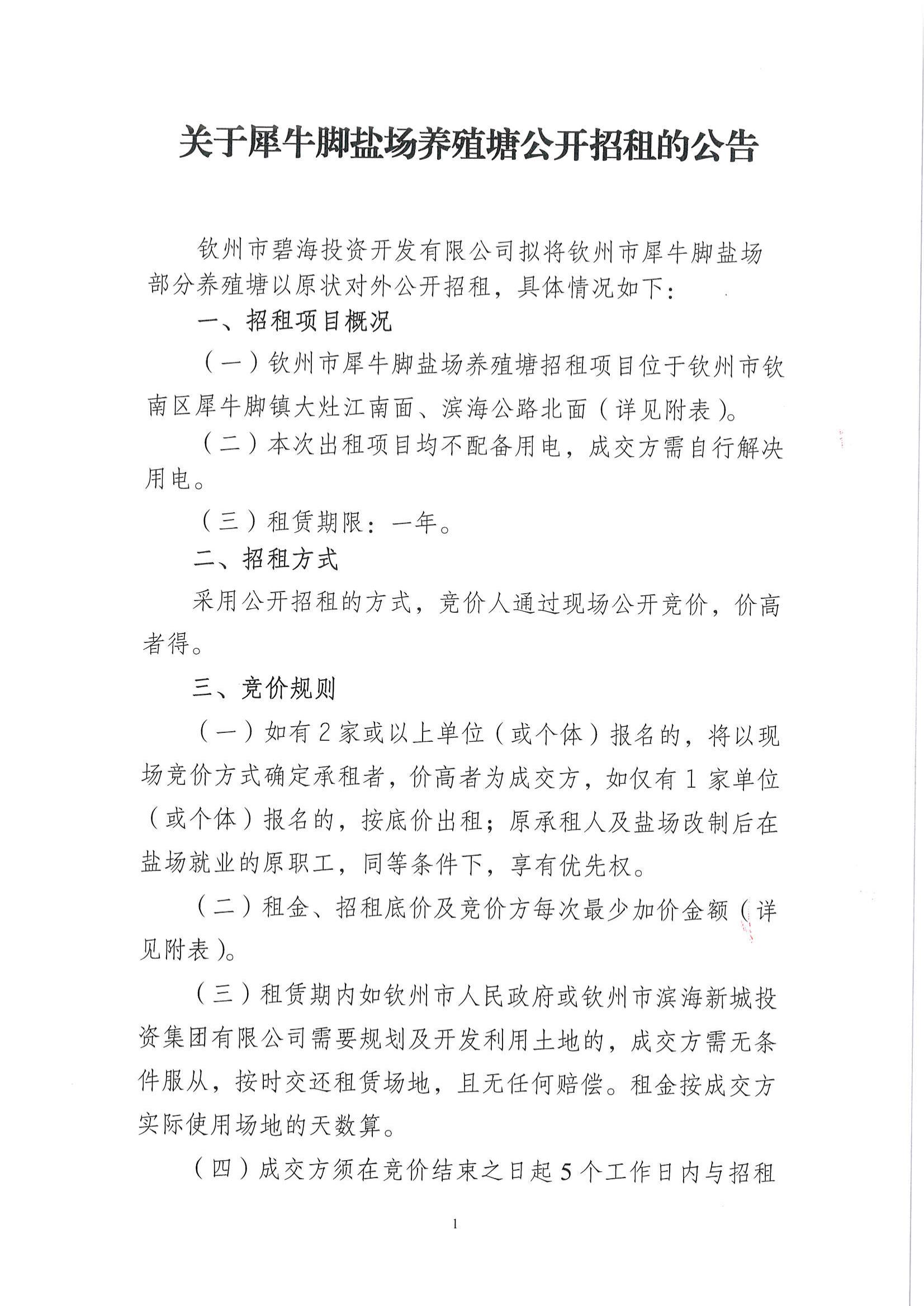 關于犀牛腳鹽場養殖塘公開招租的公告