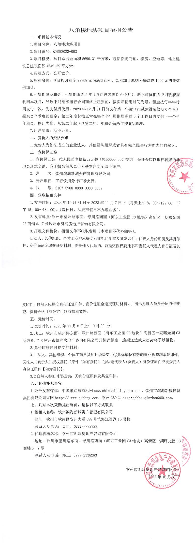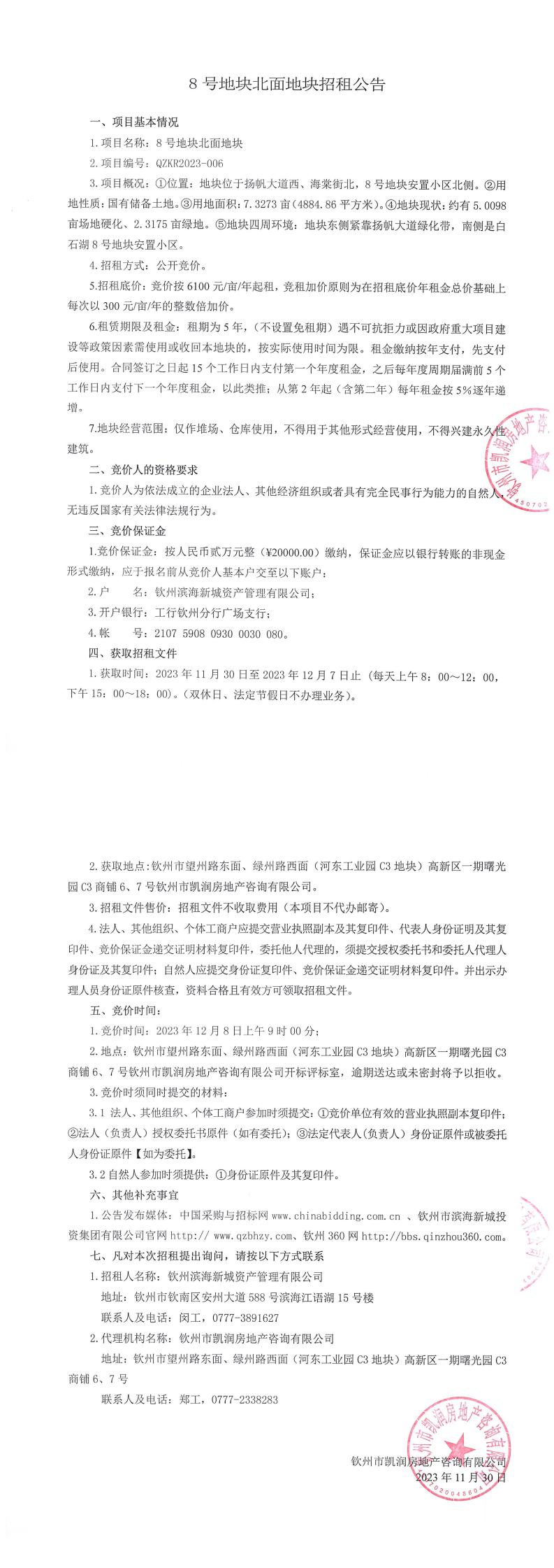 欽州市欽南區(qū)沙埠鎮(zhèn)油路村委上下虎壩村入口三角地塊招租公告