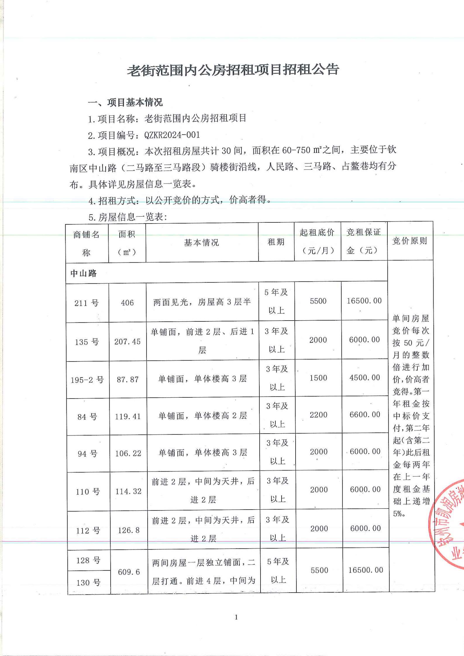 關(guān)于欽州市老街范圍中山路47-1號房屋公開招租的公告