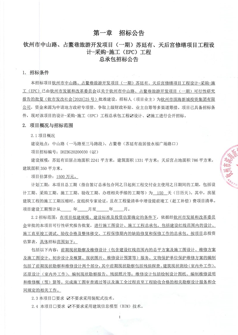 欽州市中山路、占鰲巷旅游開發項目(一期)蘇廷有、天后宮修繕項目工程設計-采購-施工(EPC)工程總承包招標公告