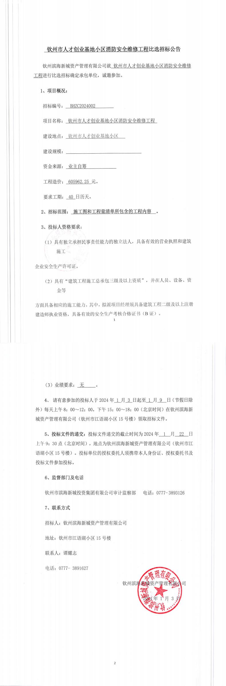 欽州市人才創(chuàng)業(yè)基地小區(qū)消防安全維修工程比選招標(biāo)公告