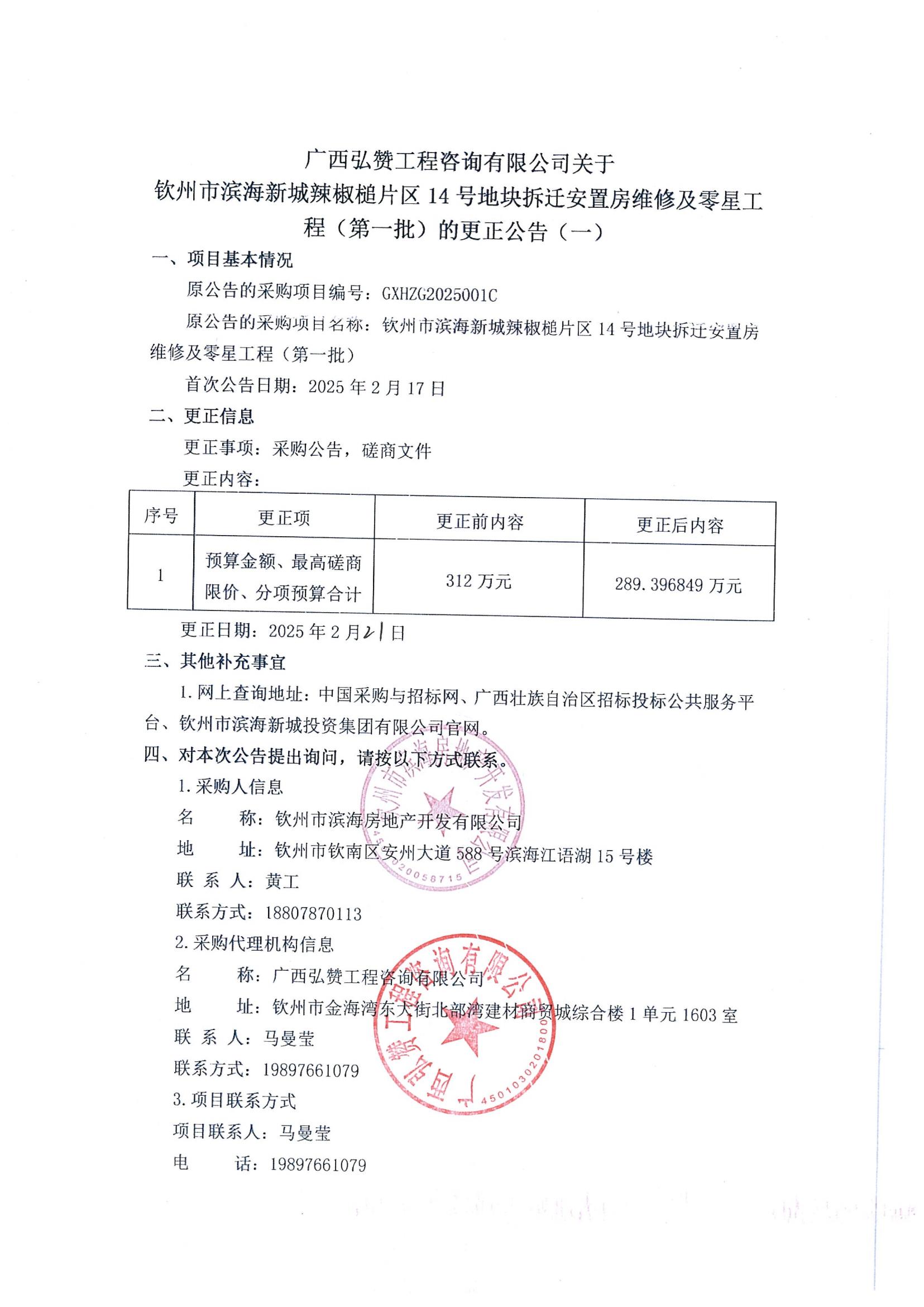 欽州市濱海新城辣椒槌片區14號地塊拆遷安置房維修及零星工程(第一批)的更正公告