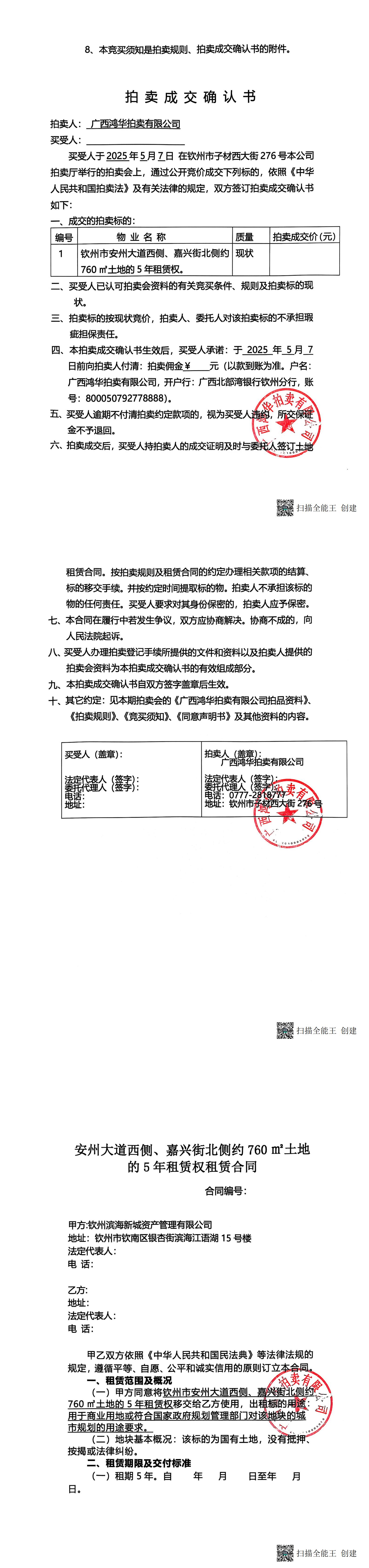 欽州市安州大道西側、嘉興街南北側約760㎡土地的5年租賃權拍賣文件(點擊下載全文)