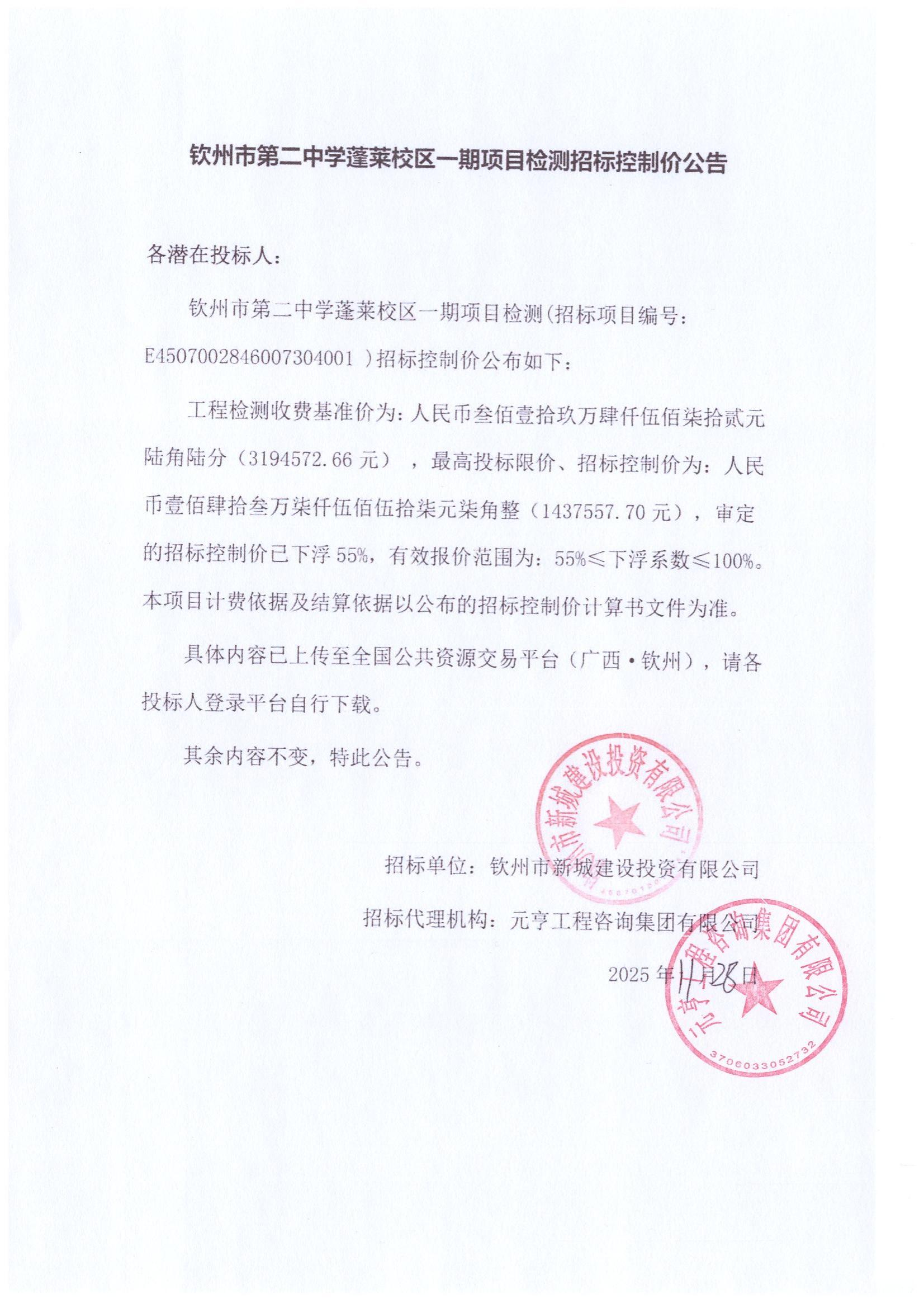 欽州市第二中學蓬萊校區一期項目檢測招標控制價公告